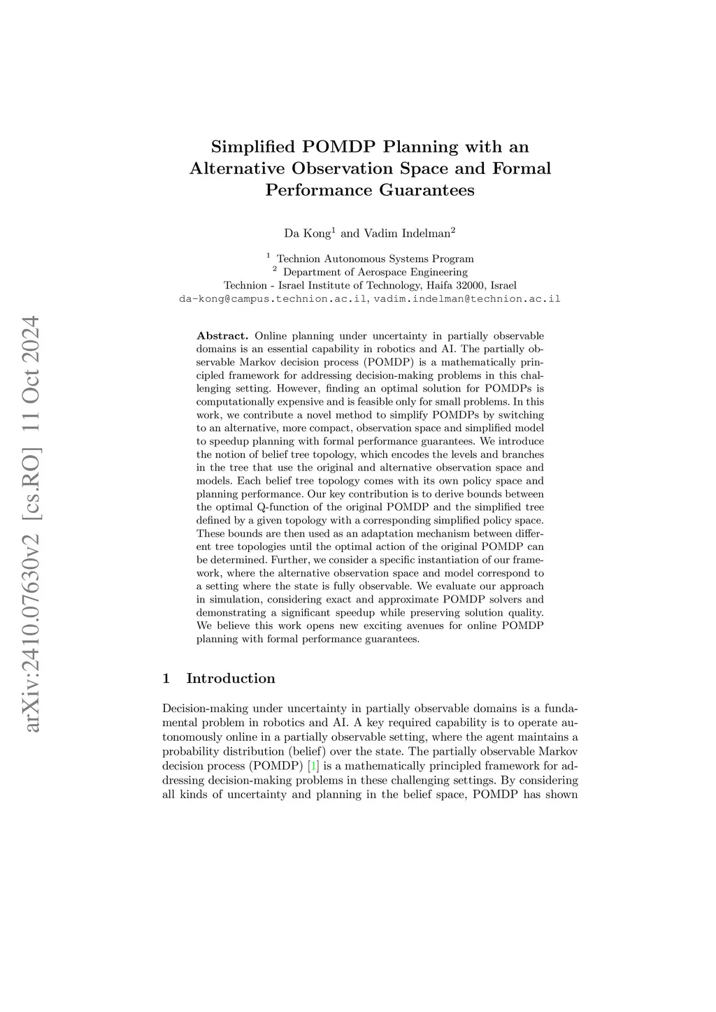 Online planning under uncertainty in partially observable domains is an essential capability in robotics and AI. The partially observable Markov decision process (POMDP) is a mathematically principled framework for addressing decision-making problems in this challenging setting. However, finding an optimal solution for POMDPs is computationally expensive and is feasible only for small problems. In this work, we contribute a novel method to simplify POMDPs by switching to an alternative, more compact, observation space and simplified model to speedup planning with formal performance guarantees. We introduce the notion of belief tree topology, which encodes the levels and branches in the tree that use the original and alternative observation space and models. Each belief tree topology comes with its own policy space and planning performance. Our key contribution is to derive bounds between the optimal Q-function of the original POMDP and the simplified tree defined by a given topology with a corresponding simplified policy space. These bounds are then used as an adaptation mechanism between different tree topologies until the optimal action of the original POMDP can be determined. Further, we consider a specific instantiation of our framework, where the alternative observation space and model correspond to a setting where the state is fully observable. We evaluate our approach in simulation, considering exact and approximate POMDP solvers and demonstrating a significant speedup while preserving solution quality. We believe this work opens new exciting avenues for online POMDP planning with formal performance guarantees.