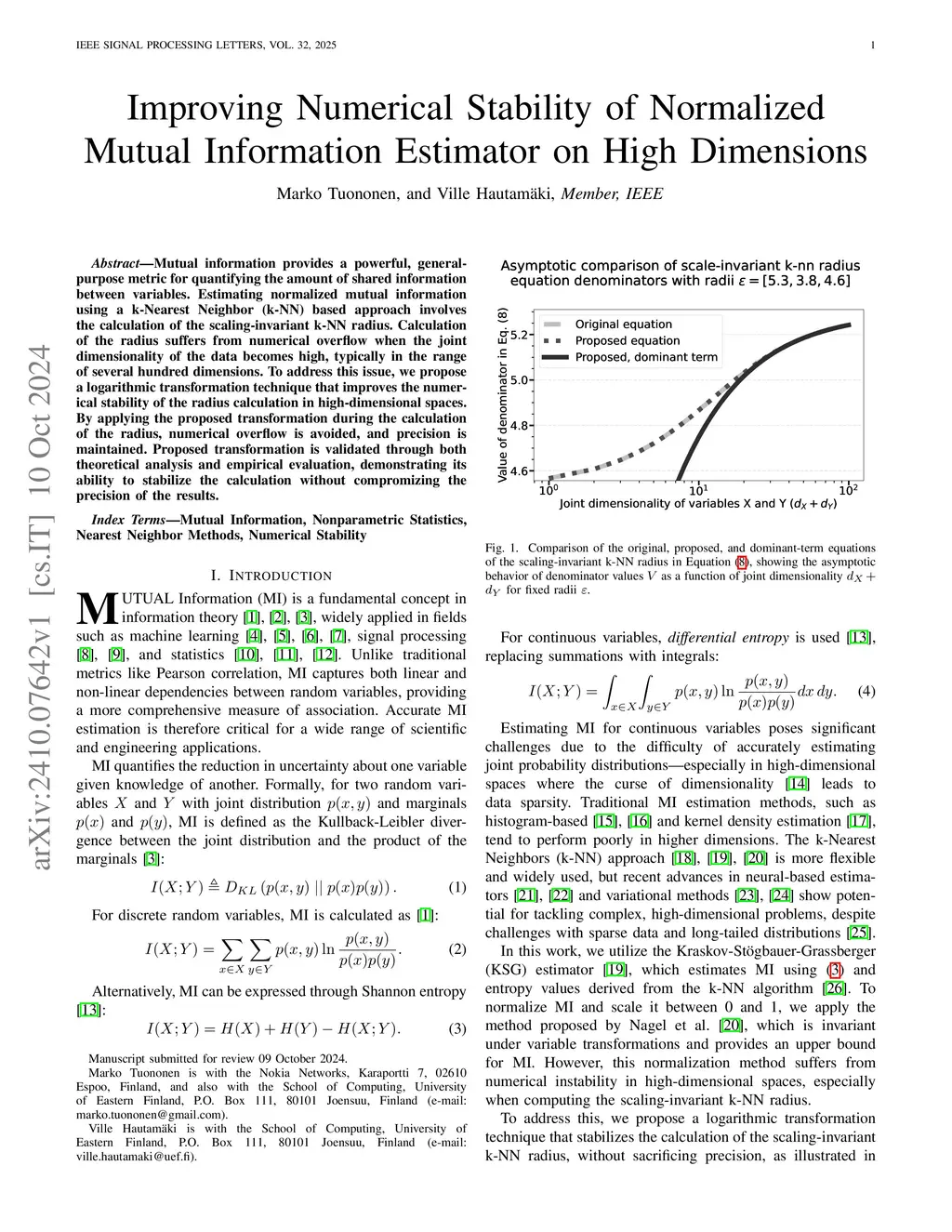 Mutual information provides a powerful, general-purpose metric for quantifying the amount of shared information between variables. Estimating normalized mutual information using a k-Nearest Neighbor (k-NN) based approach involves the calculation of the scaling-invariant k-NN radius. Calculation of the radius suffers from numerical overflow when the joint dimensionality of the data becomes high, typically in the range of several hundred dimensions. To address this issue, we propose a logarithmic transformation technique that improves the numerical stability of the radius calculation in high-dimensional spaces. By applying the proposed transformation during the calculation of the radius, numerical overflow is avoided, and precision is maintained. Proposed transformation is validated through both theoretical analysis and empirical evaluation, demonstrating its ability to stabilize the calculation without compromising precision, increasing bias, or adding significant computational overhead, while also helping to maintain estimator variance.