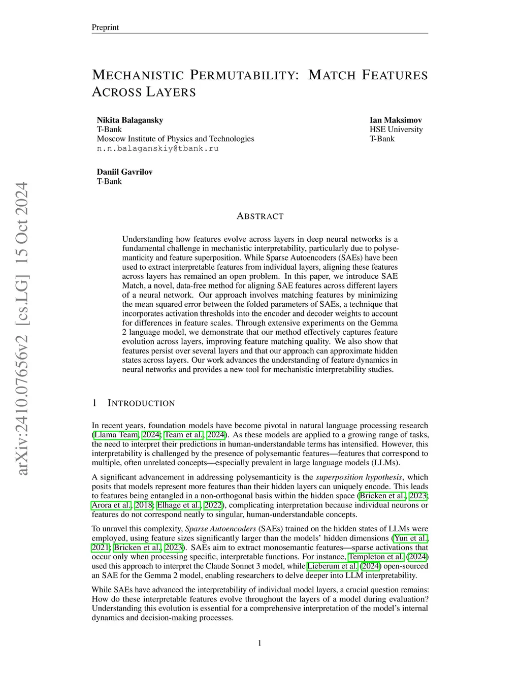 Understanding how features evolve across layers in deep neural networks is a fundamental challenge in mechanistic interpretability, particularly due to polysemanticity and feature superposition. While Sparse Autoencoders (SAEs) have been used to extract interpretable features from individual layers, aligning these features across layers has remained an open problem. In this paper, we introduce SAE Match, a novel, data-free method for aligning SAE features across different layers of a neural network. Our approach involves matching features by minimizing the mean squared error between the folded parameters of SAEs, a technique that incorporates activation thresholds into the encoder and decoder weights to account for differences in feature scales. Through extensive experiments on the Gemma 2 language model, we demonstrate that our method effectively captures feature evolution across layers, improving feature matching quality. We also show that features persist over several layers and that our approach can approximate hidden states across layers. Our work advances the understanding of feature dynamics in neural networks and provides a new tool for mechanistic interpretability studies.