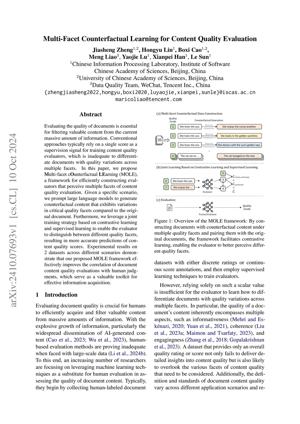 Evaluating the quality of documents is essential for filtering valuable content from the current massive amount of information. Conventional approaches typically rely on a single score as a supervision signal for training content quality evaluators, which is inadequate to differentiate documents with quality variations across multiple facets. In this paper, we propose Multi-facet cOunterfactual LEarning (MOLE), a framework for efficiently constructing evaluators that perceive multiple facets of content quality evaluation. Given a specific scenario, we prompt large language models to generate counterfactual content that exhibits variations in critical quality facets compared to the original document. Furthermore, we leverage a joint training strategy based on contrastive learning and supervised learning to enable the evaluator to distinguish between different quality facets, resulting in more accurate predictions of content quality scores. Experimental results on 2 datasets across different scenarios demonstrate that our proposed MOLE framework effectively improves the correlation of document content quality evaluations with human judgments, which serve as a valuable toolkit for effective information acquisition.