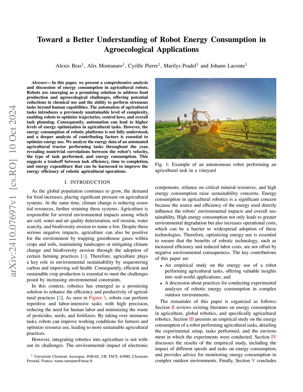 In this paper, we present a comprehensive analysis and discussion of energy consumption in agricultural robots. Robots are emerging as a promising solution to address food production and agroecological challenges, offering potential reductions in chemical use and the ability to perform strenuous tasks beyond human capabilities. The automation of agricultural tasks introduces a previously unattainable level of complexity, enabling robots to optimize trajectories, control laws, and overall task planning. Consequently, automation can lead to higher levels of energy optimization in agricultural tasks. However, the energy consumption of robotic platforms is not fully understood, and a deeper analysis of contributing factors is essential to optimize energy use. We analyze the energy data of an automated agricultural tractor performing tasks throughout the year, revealing nontrivial correlations between the robot's velocity, the type of task performed, and energy consumption. This suggests a tradeoff between task efficiency, time to completion, and energy expenditure that can be harnessed to improve the energy efficiency of robotic agricultural operations.
