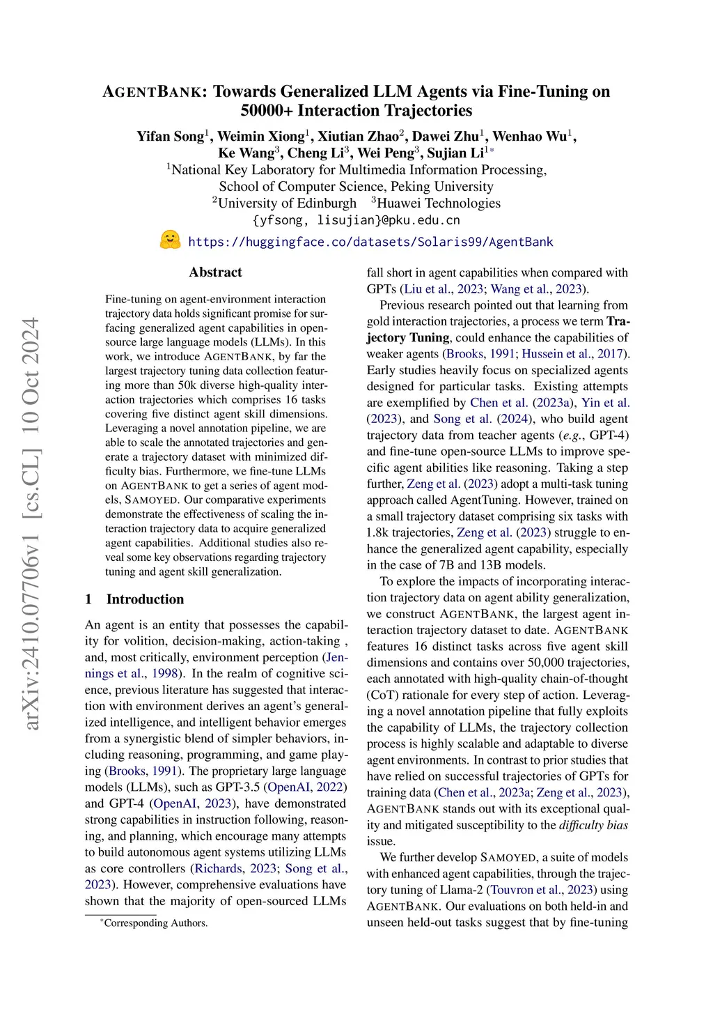 Fine-tuning on agent-environment interaction trajectory data holds significant promise for surfacing generalized agent capabilities in open-source large language models (LLMs). In this work, we introduce AgentBank, by far the largest trajectory tuning data collection featuring more than 50k diverse high-quality interaction trajectories which comprises 16 tasks covering five distinct agent skill dimensions. Leveraging a novel annotation pipeline, we are able to scale the annotated trajectories and generate a trajectory dataset with minimized difficulty bias. Furthermore, we fine-tune LLMs on AgentBank to get a series of agent models, Samoyed. Our comparative experiments demonstrate the effectiveness of scaling the interaction trajectory data to acquire generalized agent capabilities. Additional studies also reveal some key observations regarding trajectory tuning and agent skill generalization.