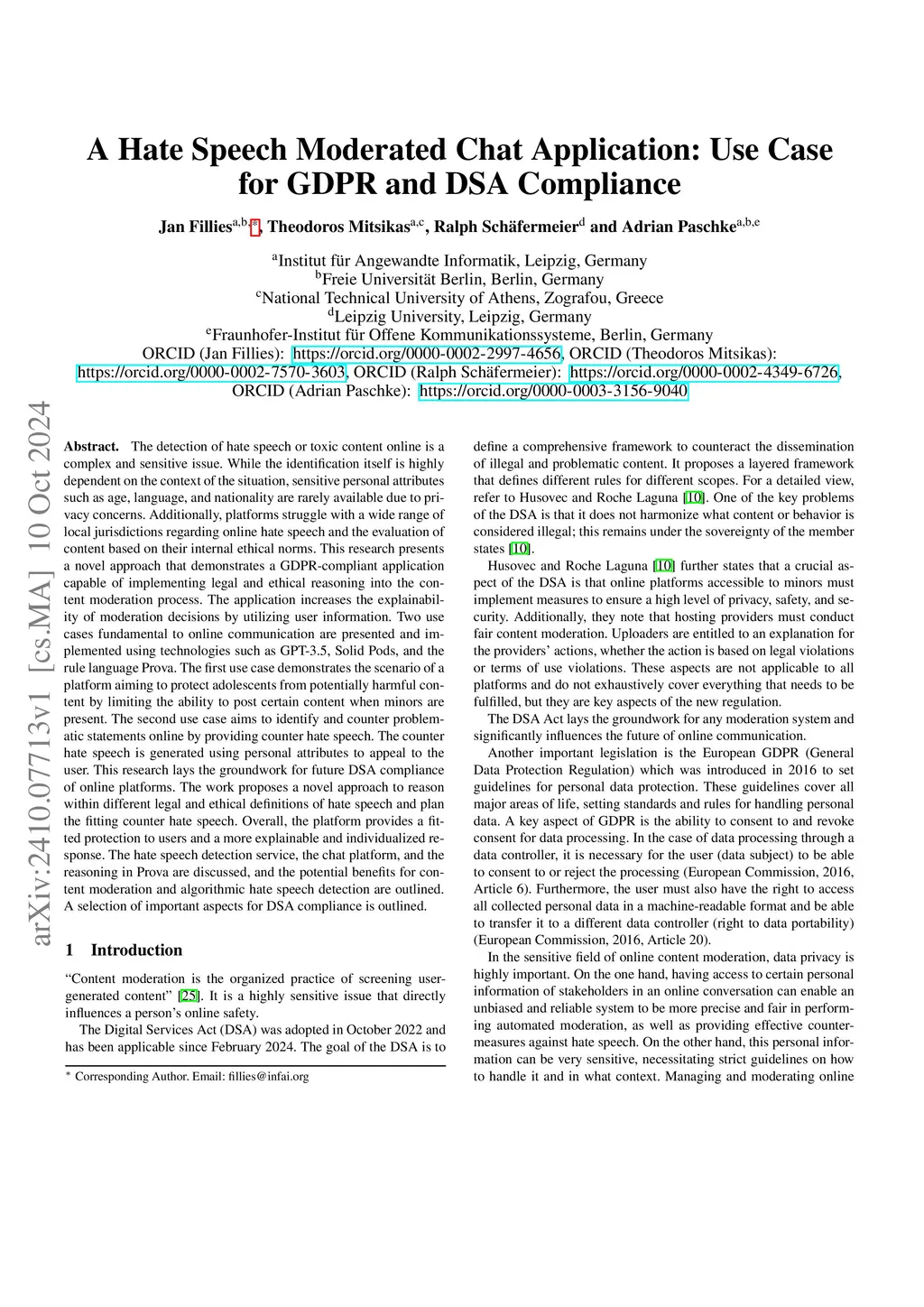 A Hate Speech Moderated Chat Application: Use Case for GDPR and DSA
