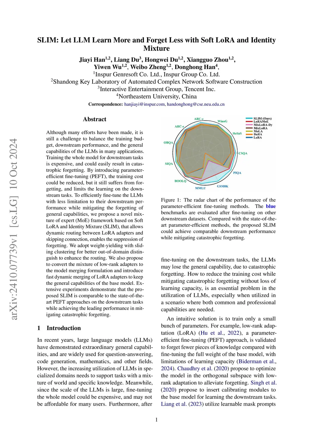 SLIM: Let LLM Learn More and Forget Less with Soft LoRA and Identity Mixture