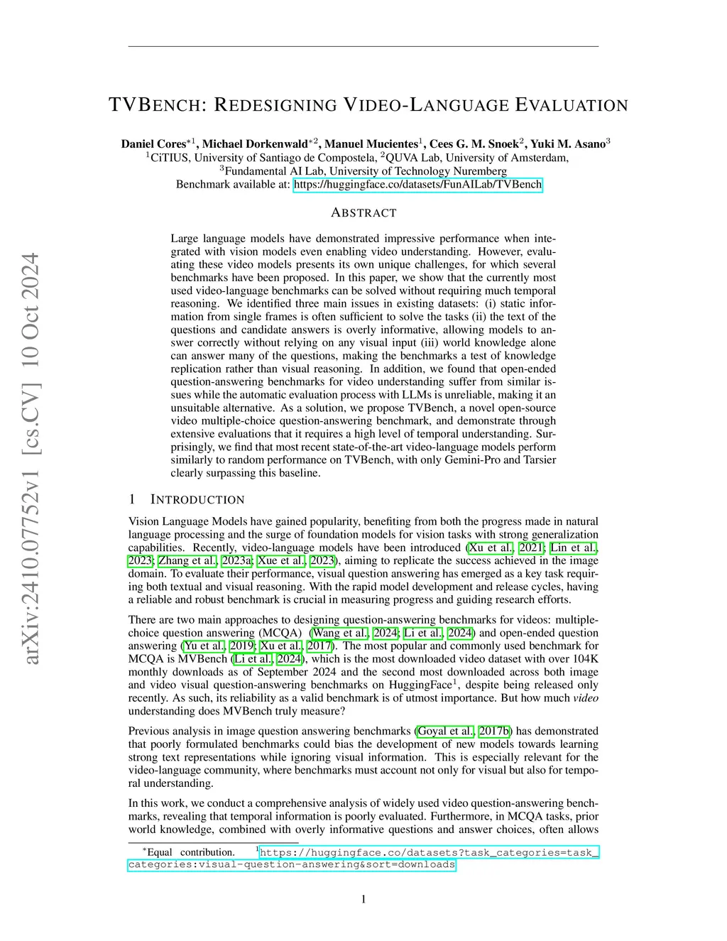 Large language models have demonstrated impressive performance when integrated with vision models even enabling video understanding. However, evaluating video models presents its own unique challenges, for which several benchmarks have been proposed. In this paper, we show that the currently most used video-language benchmarks can be solved without requiring much temporal reasoning. We identified three main issues in existing datasets: (i) static information from single frames is often sufficient to solve the tasks (ii) the text of the questions and candidate answers is overly informative, allowing models to answer correctly without relying on any visual input (iii) world knowledge alone can answer many of the questions, making the benchmarks a test of knowledge replication rather than video reasoning. In addition, we found that open-ended question-answering benchmarks for video understanding suffer from similar issues while the automatic evaluation process with LLMs is unreliable, making it an unsuitable alternative. As a solution, we propose TVBench, a novel open-source video multiple-choice question-answering benchmark, and demonstrate through extensive evaluations that it requires a high level of temporal understanding. Surprisingly, we find that most recent state-of-the-art video-language models perform similarly to random performance on TVBench, with only a few models such as Qwen2-VL, and Tarsier clearly surpassing this baseline.