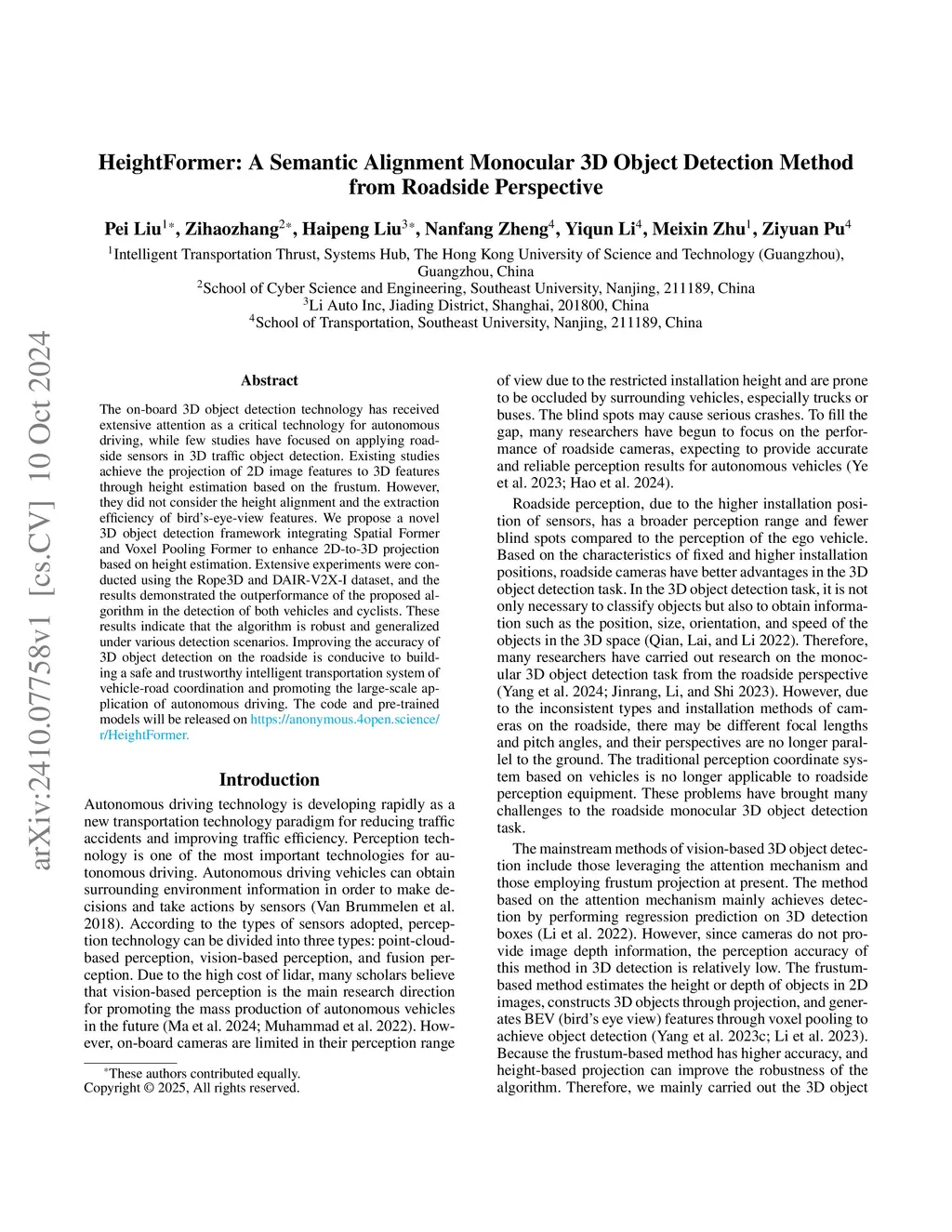 The on-board 3D object detection technology has received extensive attention as a critical technology for autonomous driving, while few studies have focused on applying roadside sensors in 3D traffic object detection. Existing studies achieve the projection of 2D image features to 3D features through height estimation based on the frustum. However, they did not consider the height alignment and the extraction efficiency of bird's-eye-view features. We propose a novel 3D object detection framework integrating Spatial Former and Voxel Pooling Former to enhance 2D-to-3D projection based on height estimation. Extensive experiments were conducted using the Rope3D and DAIR-V2X-I dataset, and the results demonstrated the outperformance of the proposed algorithm in the detection of both vehicles and cyclists. These results indicate that the algorithm is robust and generalized under various detection scenarios. Improving the accuracy of 3D object detection on the roadside is conducive to building a safe and trustworthy intelligent transportation system of vehicle-road coordination and promoting the large-scale application of autonomous driving. The code and pre-trained models will be released on https://anonymous.4open.science/r/HeightFormer.