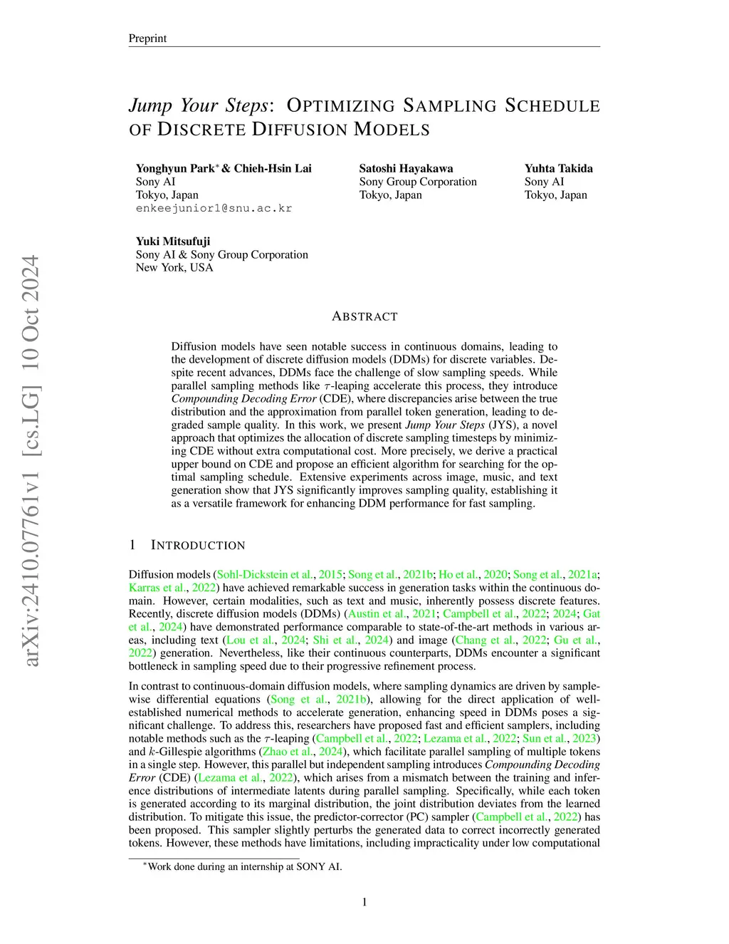 Diffusion models have seen notable success in continuous domains, leading to the development of discrete diffusion models (DDMs) for discrete variables. Despite recent advances, DDMs face the challenge of slow sampling speeds. While parallel sampling methods like -leaping accelerate this process, they introduce (CDE), where discrepancies arise between the true distribution and the approximation from parallel token generation, leading to degraded sample quality. In this work, we present (JYS), a novel approach that optimizes the allocation of discrete sampling timesteps by minimizing CDE without extra computational cost. More precisely, we derive a practical upper bound on CDE and propose an efficient algorithm for searching for the optimal sampling schedule. Extensive experiments across image, music, and text generation show that JYS significantly improves sampling quality, establishing it as a versatile framework for enhancing DDM performance for fast sampling.