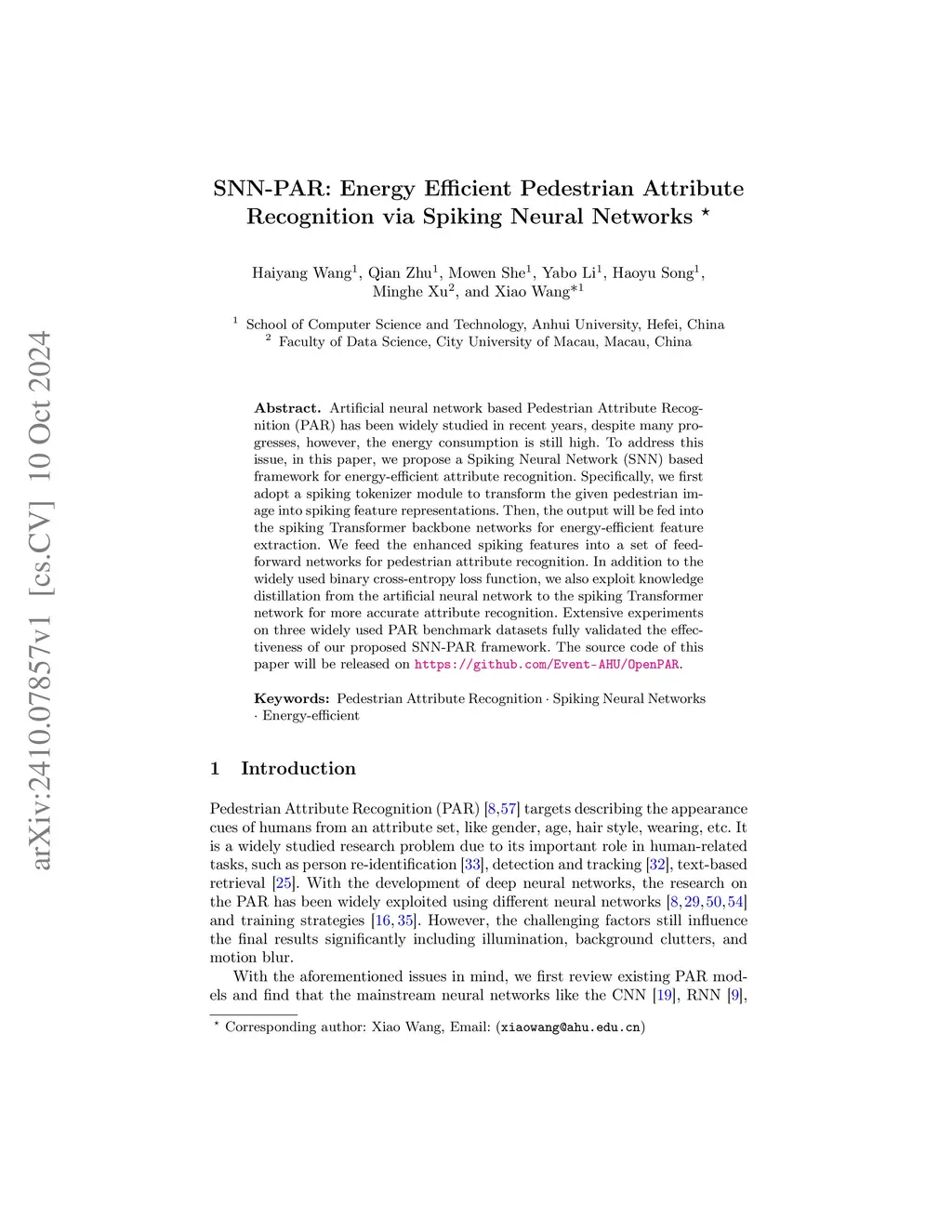 Artificial neural network based Pedestrian Attribute Recognition (PAR) has been widely studied in recent years, despite many progresses, however, the energy consumption is still high. To address this issue, in this paper, we propose a Spiking Neural Network (SNN) based framework for energy-efficient attribute recognition. Specifically, we first adopt a spiking tokenizer module to transform the given pedestrian image into spiking feature representations. Then, the output will be fed into the spiking Transformer backbone networks for energy-efficient feature extraction. We feed the enhanced spiking features into a set of feed-forward networks for pedestrian attribute recognition. In addition to the widely used binary cross-entropy loss function, we also exploit knowledge distillation from the artificial neural network to the spiking Transformer network for more accurate attribute recognition. Extensive experiments on three widely used PAR benchmark datasets fully validated the effectiveness of our proposed SNN-PAR framework. The source code of this paper is released on \url{https://github.com/Event-AHU/OpenPAR}.