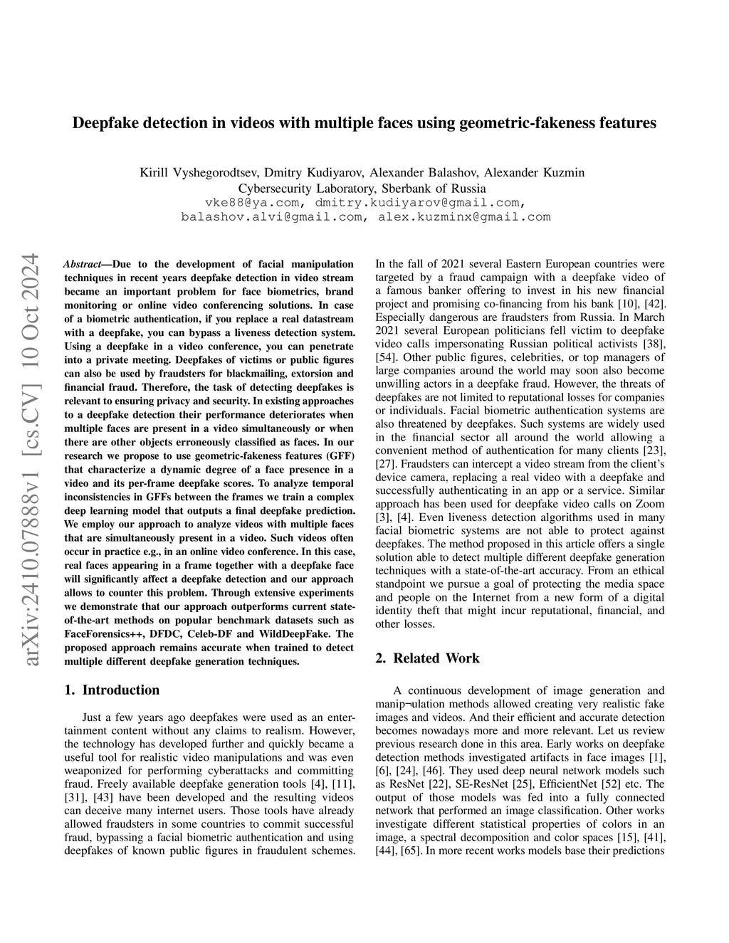 Due to the development of facial manipulation techniques in recent years deepfake detection in video stream became an important problem for face biometrics, brand monitoring or online video conferencing solutions. In case of a biometric authentication, if you replace a real datastream with a deepfake, you can bypass a liveness detection system. Using a deepfake in a video conference, you can penetrate into a private meeting. Deepfakes of victims or public figures can also be used by fraudsters for blackmailing, extorsion and financial fraud. Therefore, the task of detecting deepfakes is relevant to ensuring privacy and security. In existing approaches to a deepfake detection their performance deteriorates when multiple faces are present in a video simultaneously or when there are other objects erroneously classified as faces. In our research we propose to use geometric-fakeness features (GFF) that characterize a dynamic degree of a face presence in a video and its per-frame deepfake scores. To analyze temporal inconsistencies in GFFs between the frames we train a complex deep learning model that outputs a final deepfake prediction. We employ our approach to analyze videos with multiple faces that are simultaneously present in a video. Such videos often occur in practice e.g., in an online video conference. In this case, real faces appearing in a frame together with a deepfake face will significantly affect a deepfake detection and our approach allows to counter this problem. Through extensive experiments we demonstrate that our approach outperforms current state-of-the-art methods on popular benchmark datasets such as FaceForensics++, DFDC, Celeb-DF and WildDeepFake. The proposed approach remains accurate when trained to detect multiple different deepfake generation techniques.