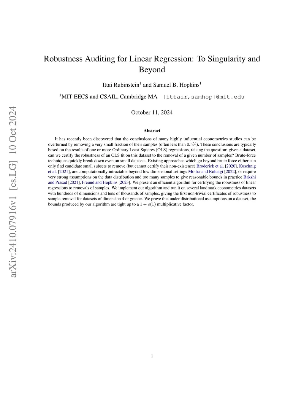 It has recently been discovered that the conclusions of many highly influential econometrics studies can be overturned by removing a very small fraction of their samples (often less than ). These conclusions are typically based on the results of one or more Ordinary Least Squares (OLS) regressions, raising the question: given a dataset, can we certify the robustness of an OLS fit on this dataset to the removal of a given number of samples? Brute-force techniques quickly break down even on small datasets. Existing approaches which go beyond brute force either can only find candidate small subsets to remove (but cannot certify their non-existence) [BGM20, KZC21], are computationally intractable beyond low dimensional settings [MR22], or require very strong assumptions on the data distribution and too many samples to give reasonable bounds in practice [BP21, FH23]. We present an efficient algorithm for certifying the robustness of linear regressions to removals of samples. We implement our algorithm and run it on several landmark econometrics datasets with hundreds of dimensions and tens of thousands of samples, giving the first non-trivial certificates of robustness to sample removal for datasets of dimension or greater. We prove that under distributional assumptions on a dataset, the bounds produced by our algorithm are tight up to a multiplicative factor.