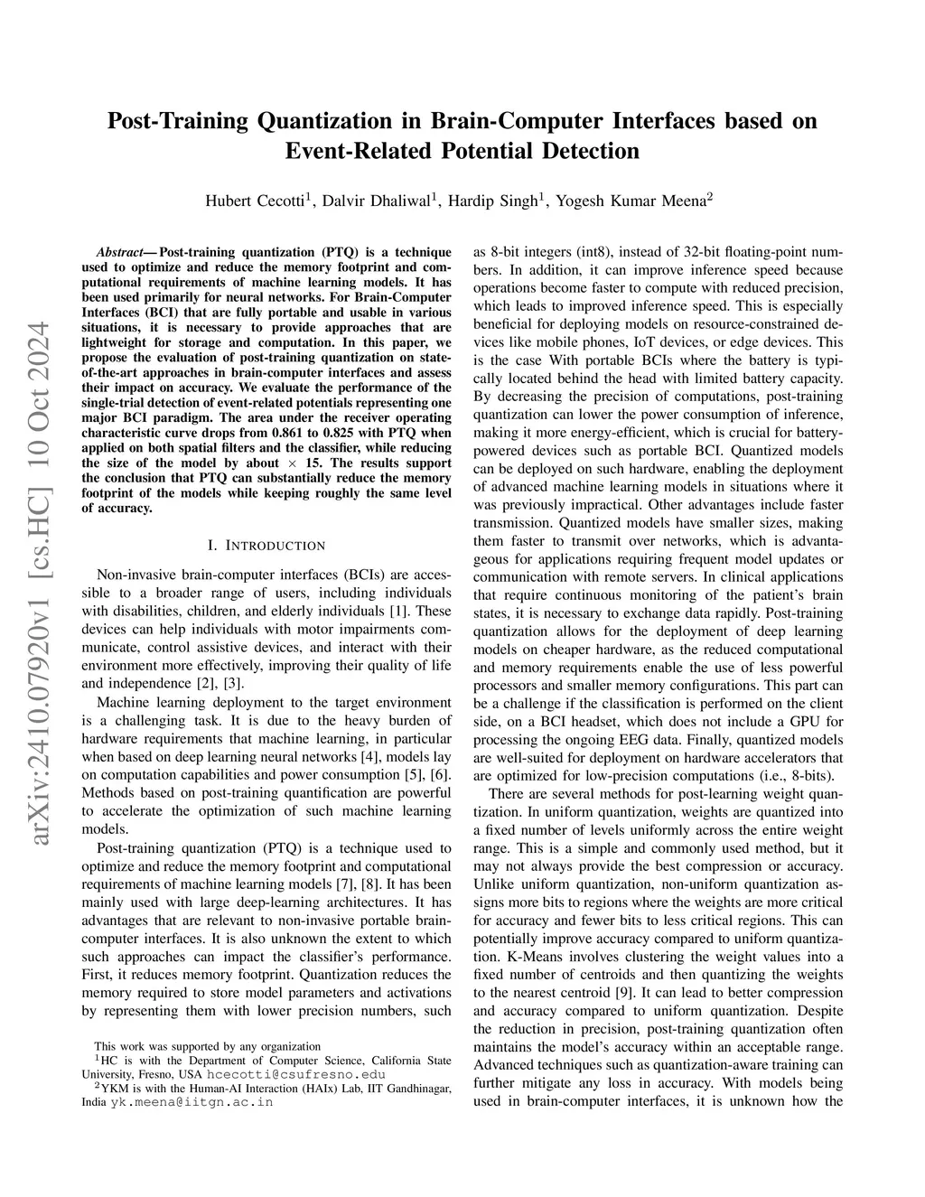 Post-training quantization (PTQ) is a technique used to optimize and reduce the memory footprint and computational requirements of machine learning models. It has been used primarily for neural networks. For Brain-Computer Interfaces (BCI) that are fully portable and usable in various situations, it is necessary to provide approaches that are lightweight for storage and computation. In this paper, we propose the evaluation of post-training quantization on state-of-the-art approaches in brain-computer interfaces and assess their impact on accuracy. We evaluate the performance of the single-trial detection of event-related potentials representing one major BCI paradigm. The area under the receiver operating characteristic curve drops from 0.861 to 0.825 with PTQ when applied on both spatial filters and the classifier, while reducing the size of the model by about 15. The results support the conclusion that PTQ can substantially reduce the memory footprint of the models while keeping roughly the same level of accuracy.