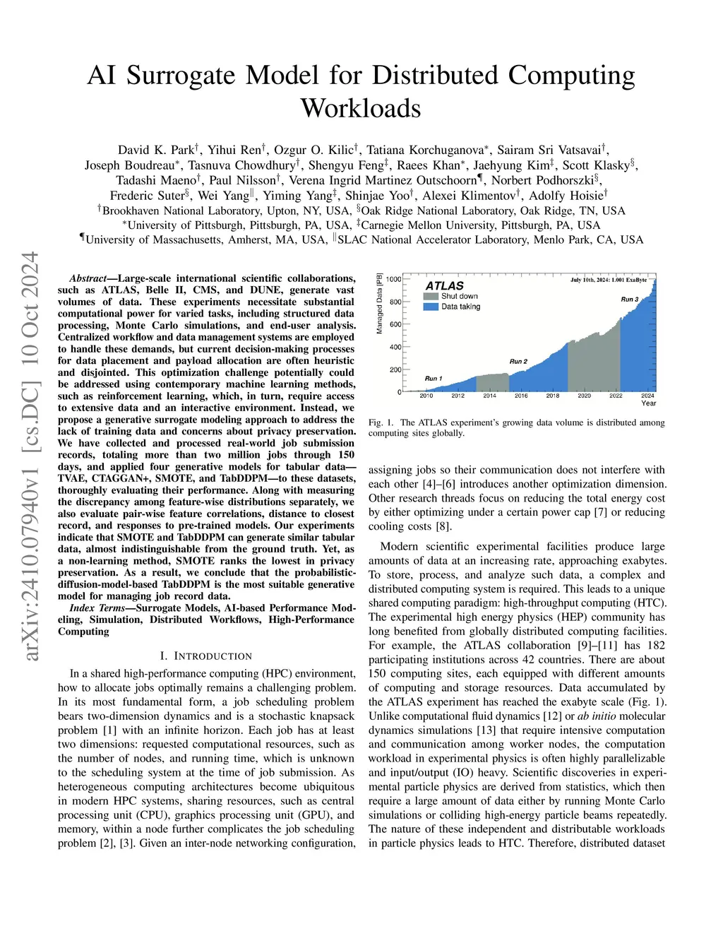 Large-scale international scientific collaborations, such as ATLAS, Belle II, CMS, and DUNE, generate vast volumes of data. These experiments necessitate substantial computational power for varied tasks, including structured data processing, Monte Carlo simulations, and end-user analysis. Centralized workflow and data management systems are employed to handle these demands, but current decision-making processes for data placement and payload allocation are often heuristic and disjointed. This optimization challenge potentially could be addressed using contemporary machine learning methods, such as reinforcement learning, which, in turn, require access to extensive data and an interactive environment. Instead, we propose a generative surrogate modeling approach to address the lack of training data and concerns about privacy preservation. We have collected and processed real-world job submission records, totaling more than two million jobs through 150 days, and applied four generative models for tabular data -- TVAE, CTAGGAN+, SMOTE, and TabDDPM -- to these datasets, thoroughly evaluating their performance. Along with measuring the discrepancy among feature-wise distributions separately, we also evaluate pair-wise feature correlations, distance to closest record, and responses to pre-trained models. Our experiments indicate that SMOTE and TabDDPM can generate similar tabular data, almost indistinguishable from the ground truth. Yet, as a non-learning method, SMOTE ranks the lowest in privacy preservation. As a result, we conclude that the probabilistic-diffusion-model-based TabDDPM is the most suitable generative model for managing job record data.