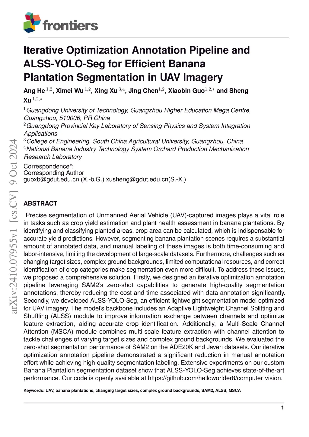 Precise segmentation of Unmanned Aerial Vehicle (UAV)-captured images plays a vital role in tasks such as crop yield estimation and plant health assessment in banana plantations. By identifying and classifying planted areas, crop area can be calculated, which is indispensable for accurate yield predictions. However, segmenting banana plantation scenes requires a substantial amount of annotated data, and manual labeling of these images is both time-consuming and labor-intensive, limiting the development of large-scale datasets. Furthermore, challenges such as changing target sizes, complex ground backgrounds, limited computational resources, and correct identification of crop categories make segmentation even more difficult. To address these issues, we proposed a comprehensive solution. Firstly, we designed an iterative optimization annotation pipeline leveraging SAM2's zero-shot capabilities to generate high-quality segmentation annotations, thereby reducing the cost and time associated with data annotation significantly. Secondly, we developed ALSS-YOLO-Seg, an efficient lightweight segmentation model optimized for UAV imagery. The model's backbone includes an Adaptive Lightweight Channel Splitting and Shuffling (ALSS) module to improve information exchange between channels and optimize feature extraction, aiding accurate crop identification. Additionally, a Multi-Scale Channel Attention (MSCA) module combines multi-scale feature extraction with channel attention to tackle challenges of varying target sizes and complex ground backgrounds.