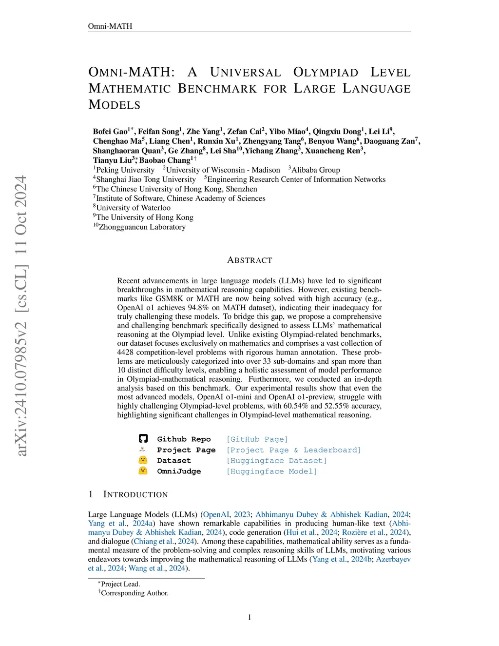 Recent advancements in large language models (LLMs) have led to significant breakthroughs in mathematical reasoning capabilities. However, existing benchmarks like GSM8K or MATH are now being solved with high accuracy (e.g., OpenAI o1 achieves 94.8% on MATH dataset), indicating their inadequacy for truly challenging these models. To bridge this gap, we propose a comprehensive and challenging benchmark specifically designed to assess LLMs' mathematical reasoning at the Olympiad level. Unlike existing Olympiad-related benchmarks, our dataset focuses exclusively on mathematics and comprises a vast collection of 4428 competition-level problems with rigorous human annotation. These problems are meticulously categorized into over 33 sub-domains and span more than 10 distinct difficulty levels, enabling a holistic assessment of model performance in Olympiad-mathematical reasoning. Furthermore, we conducted an in-depth analysis based on this benchmark. Our experimental results show that even the most advanced models, OpenAI o1-mini and OpenAI o1-preview, struggle with highly challenging Olympiad-level problems, with 60.54% and 52.55% accuracy, highlighting significant challenges in Olympiad-level mathematical reasoning.