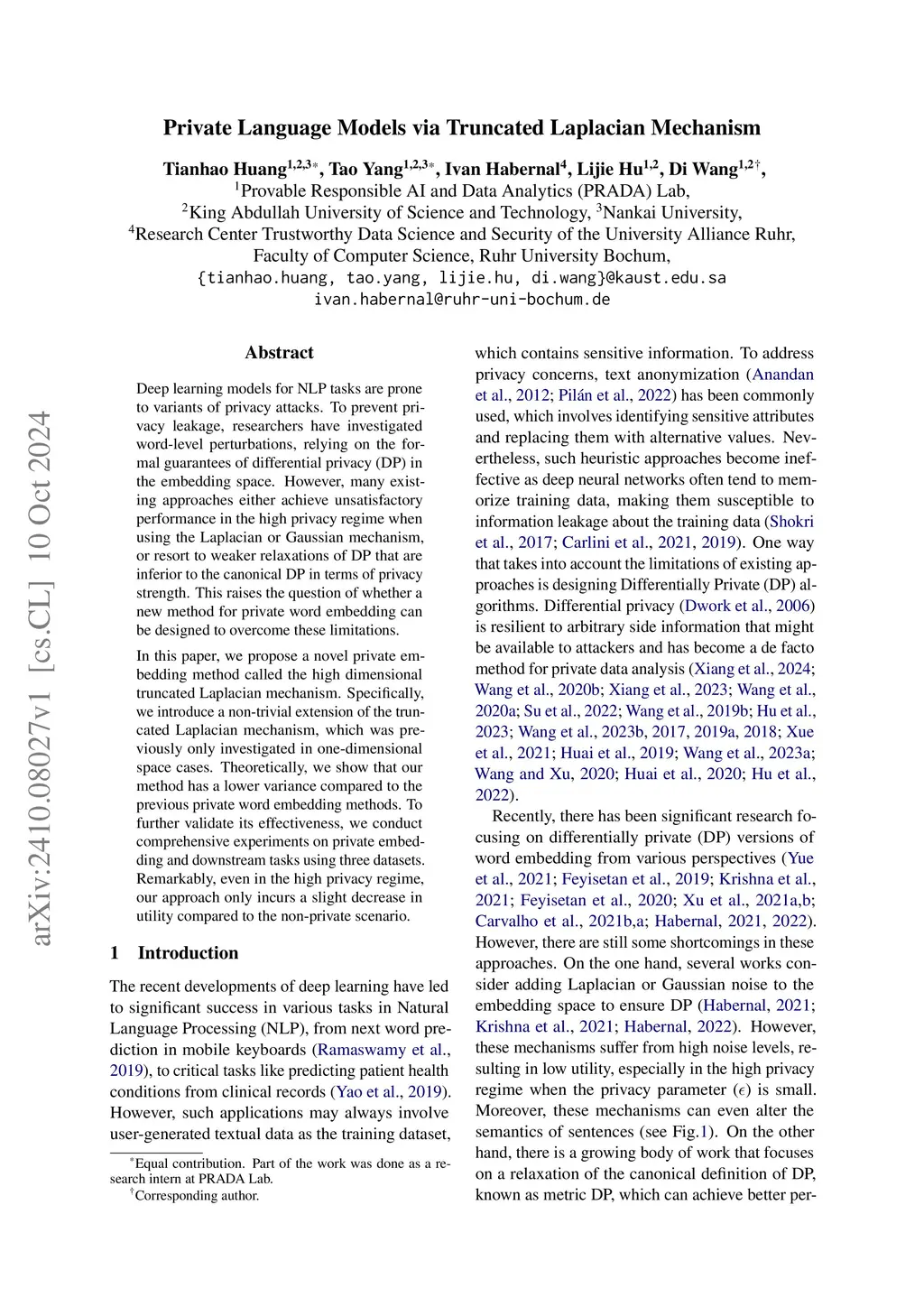 Deep learning models for NLP tasks are prone to variants of privacy attacks. To prevent privacy leakage, researchers have investigated word-level perturbations, relying on the formal guarantees of differential privacy (DP) in the embedding space. However, many existing approaches either achieve unsatisfactory performance in the high privacy regime when using the Laplacian or Gaussian mechanism, or resort to weaker relaxations of DP that are inferior to the canonical DP in terms of privacy strength. This raises the question of whether a new method for private word embedding can be designed to overcome these limitations. In this paper, we propose a novel private embedding method called the high dimensional truncated Laplacian mechanism. Specifically, we introduce a non-trivial extension of the truncated Laplacian mechanism, which was previously only investigated in one-dimensional space cases. Theoretically, we show that our method has a lower variance compared to the previous private word embedding methods. To further validate its effectiveness, we conduct comprehensive experiments on private embedding and downstream tasks using three datasets. Remarkably, even in the high privacy regime, our approach only incurs a slight decrease in utility compared to the non-private scenario.