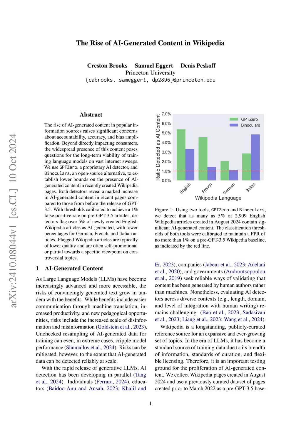 The rise of AI-generated content in popular information sources raises significant concerns about accountability, accuracy, and bias amplification. Beyond directly impacting consumers, the widespread presence of this content poses questions for the long-term viability of training language models on vast internet sweeps. We use GPTZero, a proprietary AI detector, and Binoculars, an open-source alternative, to establish lower bounds on the presence of AI-generated content in recently created Wikipedia pages. Both detectors reveal a marked increase in AI-generated content in recent pages compared to those from before the release of GPT-3.5. With thresholds calibrated to achieve a 1% false positive rate on pre-GPT-3.5 articles, detectors flag over 5% of newly created English Wikipedia articles as AI-generated, with lower percentages for German, French, and Italian articles. Flagged Wikipedia articles are typically of lower quality and are often self-promotional or partial towards a specific viewpoint on controversial topics.