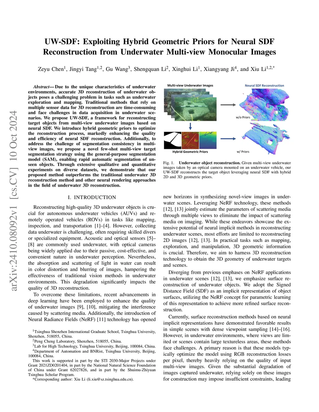 Due to the unique characteristics of underwater environments, accurate 3D reconstruction of underwater objects poses a challenging problem in tasks such as underwater exploration and mapping. Traditional methods that rely on multiple sensor data for 3D reconstruction are time-consuming and face challenges in data acquisition in underwater scenarios. We propose UW-SDF, a framework for reconstructing target objects from multi-view underwater images based on neural SDF. We introduce hybrid geometric priors to optimize the reconstruction process, markedly enhancing the quality and efficiency of neural SDF reconstruction. Additionally, to address the challenge of segmentation consistency in multi-view images, we propose a novel few-shot multi-view target segmentation strategy using the general-purpose segmentation model (SAM), enabling rapid automatic segmentation of unseen objects. Through extensive qualitative and quantitative experiments on diverse datasets, we demonstrate that our proposed method outperforms the traditional underwater 3D reconstruction method and other neural rendering approaches in the field of underwater 3D reconstruction.