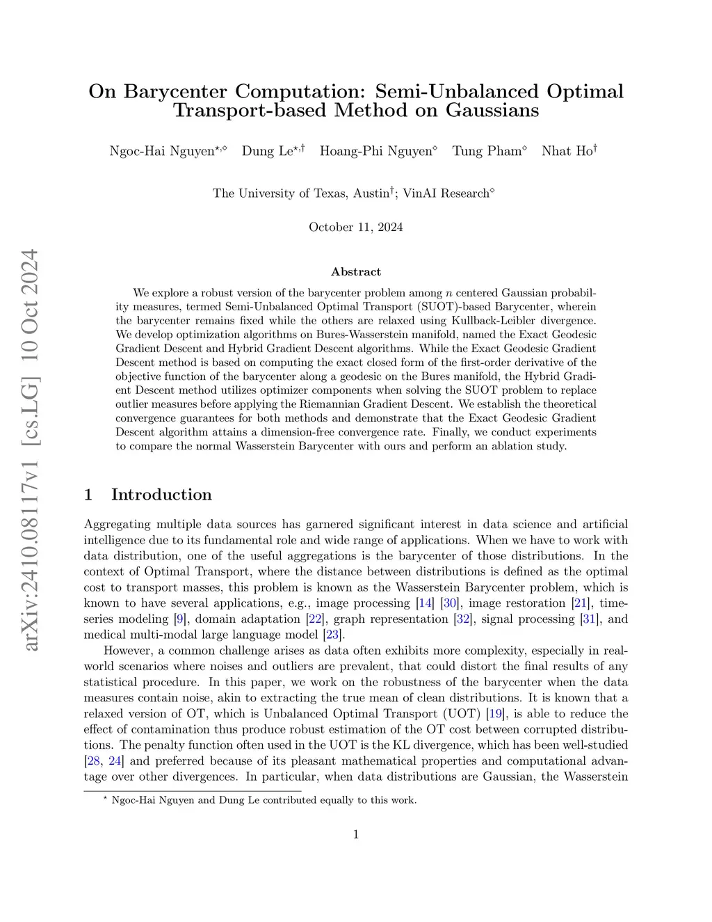 We explore a robust version of the barycenter problem among centered Gaussian probability measures, termed Semi-Unbalanced Optimal Transport (SUOT)-based Barycenter, wherein the barycenter remains fixed while the others are relaxed using Kullback-Leibler divergence. We develop optimization algorithms on Bures-Wasserstein manifold, named the Exact Geodesic Gradient Descent and Hybrid Gradient Descent algorithms. While the Exact Geodesic Gradient Descent method is based on computing the exact closed form of the first-order derivative of the objective function of the barycenter along a geodesic on the Bures manifold, the Hybrid Gradient Descent method utilizes optimizer components when solving the SUOT problem to replace outlier measures before applying the Riemannian Gradient Descent. We establish the theoretical convergence guarantees for both methods and demonstrate that the Exact Geodesic Gradient Descent algorithm attains a dimension-free convergence rate. Finally, we conduct experiments to compare the normal Wasserstein Barycenter with ours and perform an ablation study.
