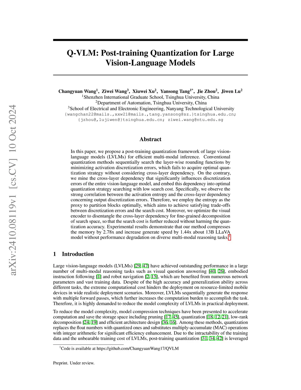 Q-VLM: Post-training Quantization for Large Vision-Language Models