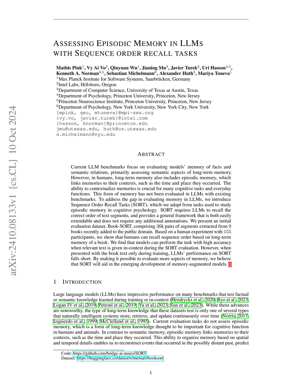 Current LLM benchmarks focus on evaluating models' memory of facts and semantic relations, primarily assessing semantic aspects of long-term memory. However, in humans, long-term memory also includes episodic memory, which links memories to their contexts, such as the time and place they occurred. The ability to contextualize memories is crucial for many cognitive tasks and everyday functions. This form of memory has not been evaluated in LLMs with existing benchmarks. To address the gap in evaluating memory in LLMs, we introduce Sequence Order Recall Tasks (SORT), which we adapt from tasks used to study episodic memory in cognitive psychology. SORT requires LLMs to recall the correct order of text segments, and provides a general framework that is both easily extendable and does not require any additional annotations. We present an initial evaluation dataset, Book-SORT, comprising 36k pairs of segments extracted from 9 books recently added to the public domain. Based on a human experiment with 155 participants, we show that humans can recall sequence order based on long-term memory of a book. We find that models can perform the task with high accuracy when relevant text is given in-context during the SORT evaluation. However, when presented with the book text only during training, LLMs' performance on SORT falls short. By allowing to evaluate more aspects of memory, we believe that SORT will aid in the emerging development of memory-augmented models.
