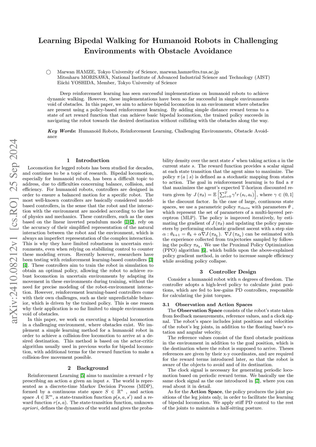 Deep reinforcement learning has seen successful implementations on humanoid robots to achieve dynamic walking. However, these implementations have been so far successful in simple environments void of obstacles. In this paper, we aim to achieve bipedal locomotion in an environment where obstacles are present using a policy-based reinforcement learning. By adding simple distance reward terms to a state of art reward function that can achieve basic bipedal locomotion, the trained policy succeeds in navigating the robot towards the desired destination without colliding with the obstacles along the way.