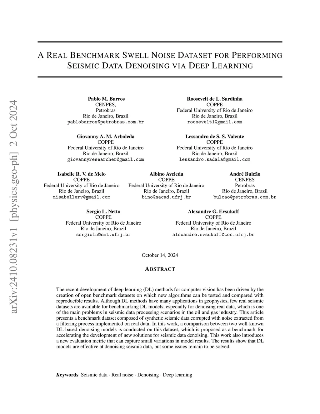 The recent development of deep learning (DL) methods for computer vision has been driven by the creation of open benchmark datasets on which new algorithms can be tested and compared with reproducible results. Although DL methods have many applications in geophysics, few real seismic datasets are available for benchmarking DL models, especially for denoising real data, which is one of the main problems in seismic data processing scenarios in the oil and gas industry. This article presents a benchmark dataset composed of synthetic seismic data corrupted with noise extracted from a filtering process implemented on real data. In this work, a comparison between two well-known DL-based denoising models is conducted on this dataset, which is proposed as a benchmark for accelerating the development of new solutions for seismic data denoising. This work also introduces a new evaluation metric that can capture small variations in model results. The results show that DL models are effective at denoising seismic data, but some issues remain to be solved.