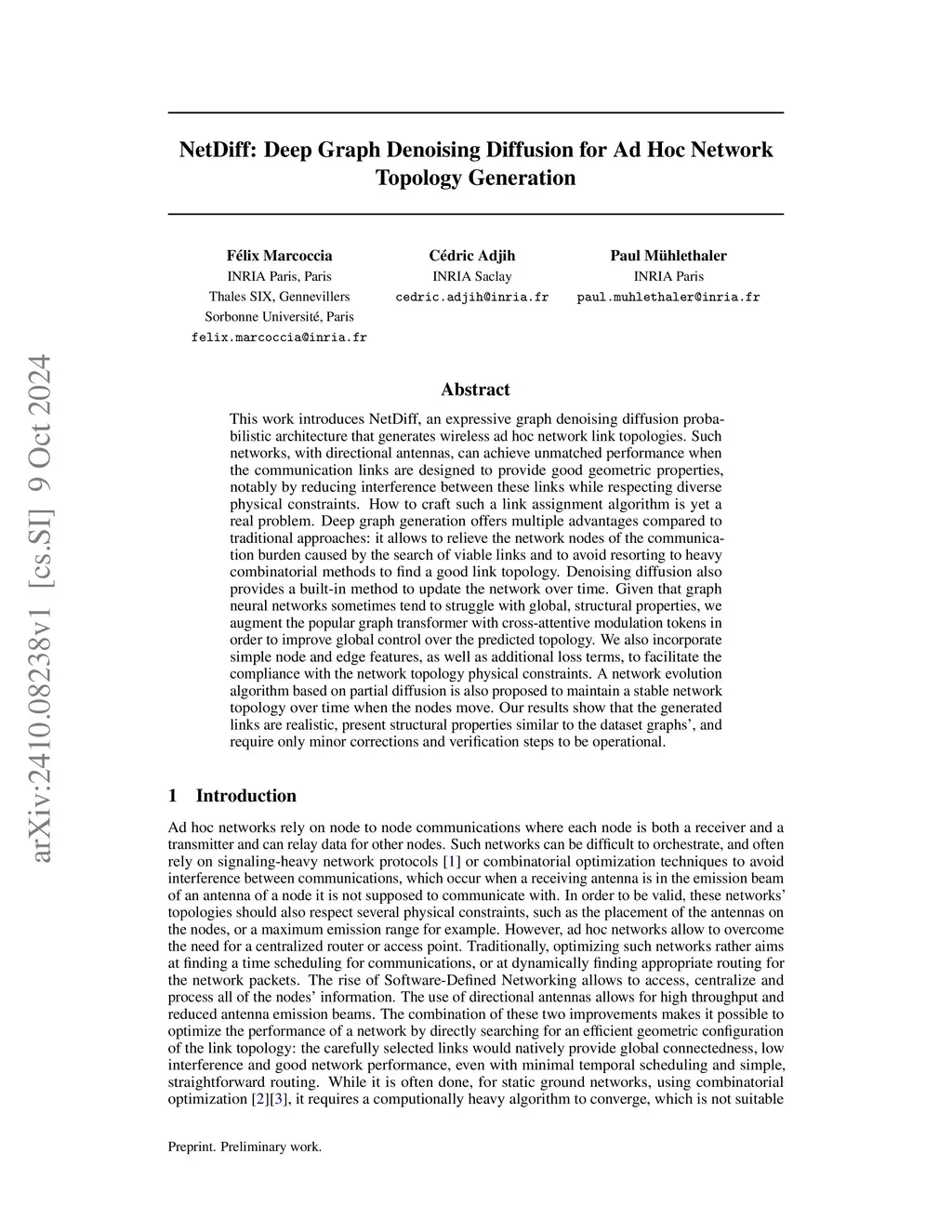 This work introduces NetDiff, an expressive graph denoising diffusion probabilistic architecture that generates wireless ad hoc network link topologies. Such networks, with directional antennas, can achieve unmatched performance when the communication links are designed to provide good geometric properties, notably by reducing interference between these links while respecting diverse physical constraints. How to craft such a link assignment algorithm is yet a real problem. Deep graph generation offers multiple advantages compared to traditional approaches: it allows to relieve the network nodes of the communication burden caused by the search of viable links and to avoid resorting to heavy combinatorial methods to find a good link topology. Denoising diffusion also provides a built-in method to update the network over time. Given that graph neural networks sometimes tend to struggle with global, structural properties, we augment the popular graph transformer with cross-attentive modulation tokens in order to improve global control over the predicted topology. We also incorporate simple node and edge features, as well as additional loss terms, to facilitate the compliance with the network topology physical constraints. A network evolution algorithm based on partial diffusion is also proposed to maintain a stable network topology over time when the nodes move. Our results show that the generated links are realistic, present structural properties similar to the dataset graphs', and require only minor corrections and verification steps to be operational.