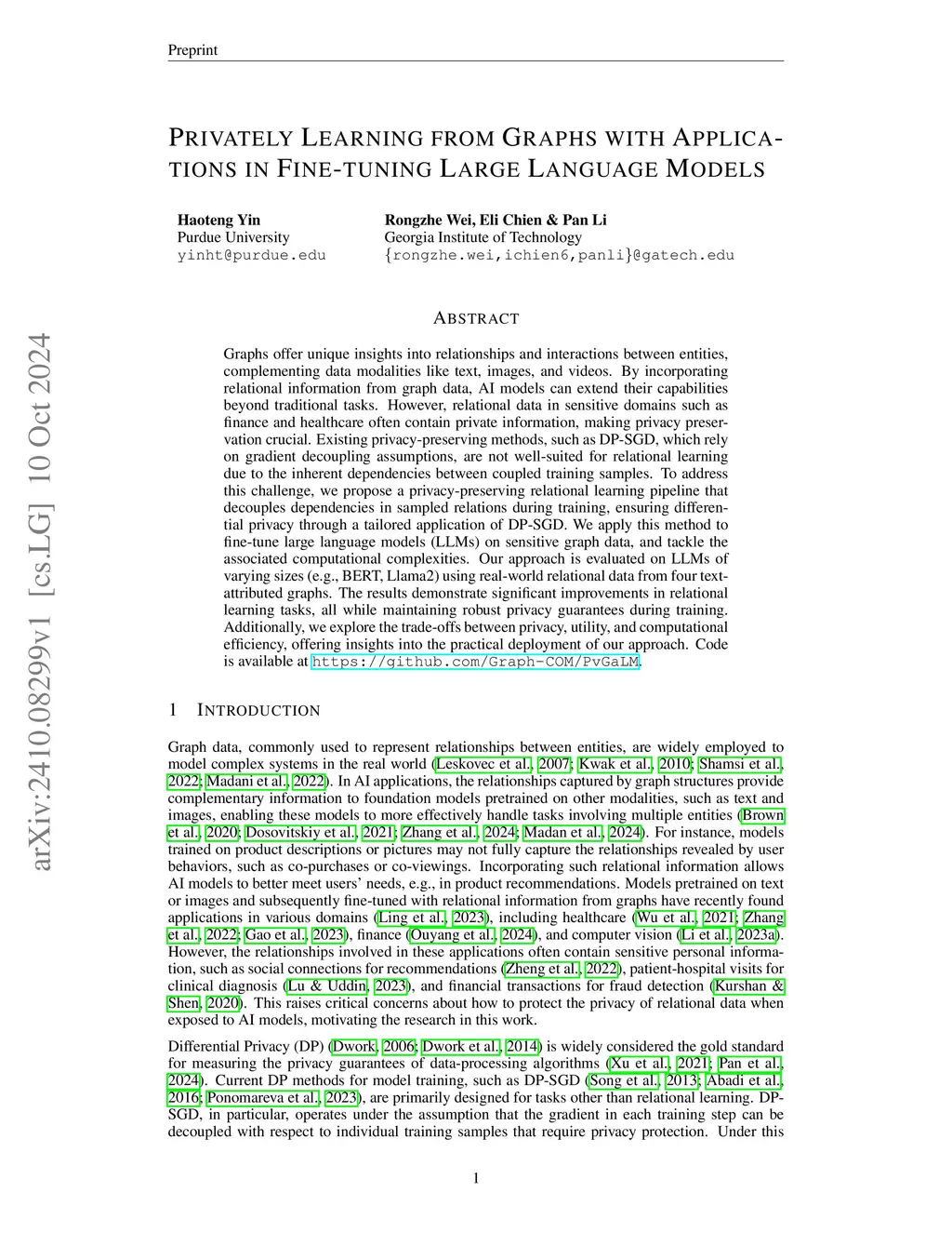 Privately Learning from Graphs with Applications in Fine-tuning Large Language Models