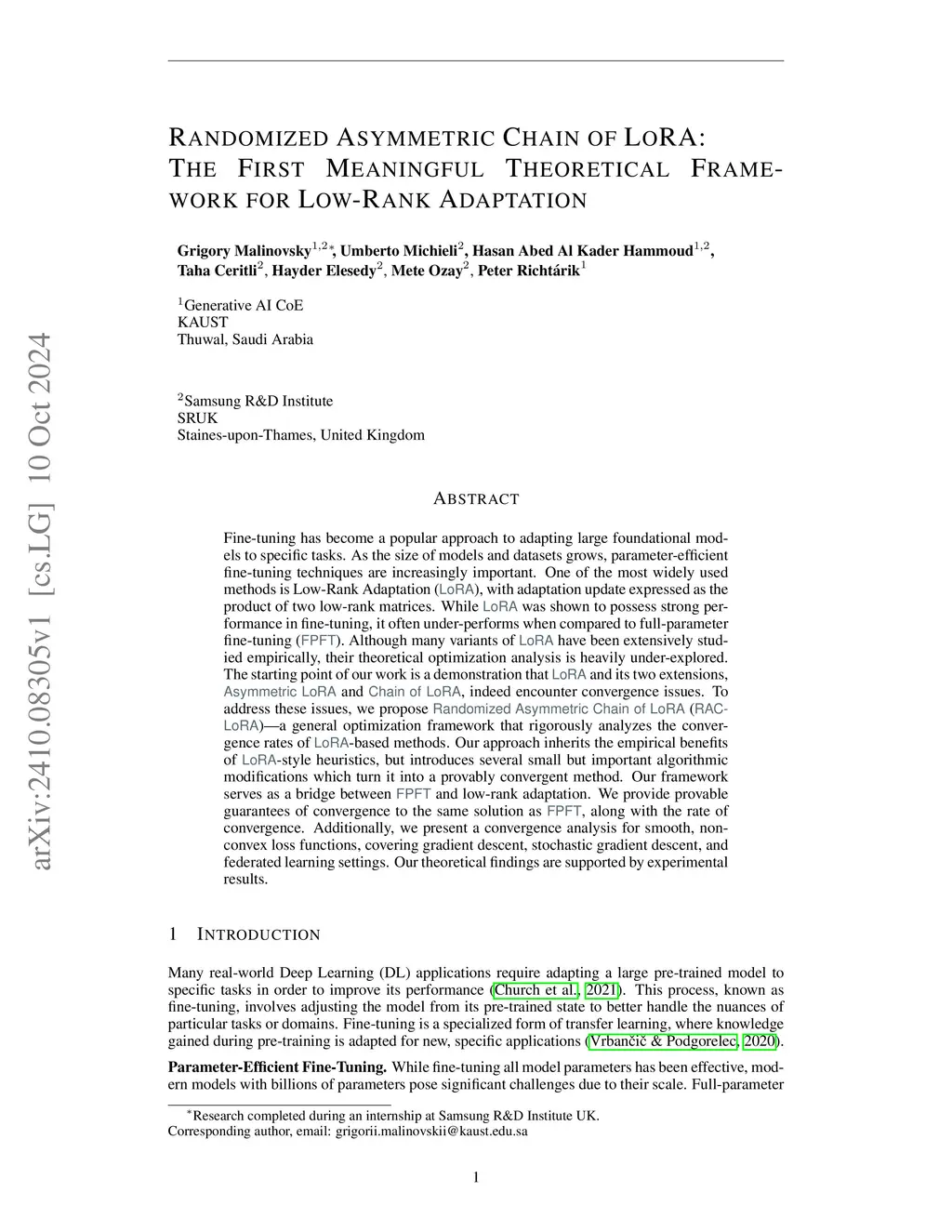Fine-tuning has become a popular approach to adapting large foundational models to specific tasks. As the size of models and datasets grows, parameter-efficient fine-tuning techniques are increasingly important. One of the most widely used methods is Low-Rank Adaptation (LoRA), with adaptation update expressed as the product of two low-rank matrices. While LoRA was shown to possess strong performance in fine-tuning, it often under-performs when compared to full-parameter fine-tuning (FPFT). Although many variants of LoRA have been extensively studied empirically, their theoretical optimization analysis is heavily under-explored. The starting point of our work is a demonstration that LoRA and its two extensions, Asymmetric LoRA and Chain of LoRA, indeed encounter convergence issues. To address these issues, we propose Randomized Asymmetric Chain of LoRA (RAC-LoRA) -- a general optimization framework that rigorously analyzes the convergence rates of LoRA-based methods. Our approach inherits the empirical benefits of LoRA-style heuristics, but introduces several small but important algorithmic modifications which turn it into a provably convergent method. Our framework serves as a bridge between FPFT and low-rank adaptation. We provide provable guarantees of convergence to the same solution as FPFT, along with the rate of convergence. Additionally, we present a convergence analysis for smooth, non-convex loss functions, covering gradient descent, stochastic gradient descent, and federated learning settings. Our theoretical findings are supported by experimental results.