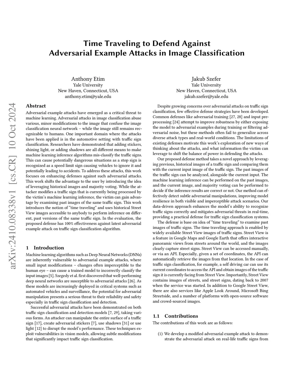 Adversarial example attacks have emerged as a critical threat to machine learning. Adversarial attacks in image classification abuse various, minor modifications to the image that confuse the image classification neural network -- while the image still remains recognizable to humans. One important domain where the attacks have been applied is in the automotive setting with traffic sign classification. Researchers have demonstrated that adding stickers, shining light, or adding shadows are all different means to make machine learning inference algorithms mis-classify the traffic signs. This can cause potentially dangerous situations as a stop sign is recognized as a speed limit sign causing vehicles to ignore it and potentially leading to accidents. To address these attacks, this work focuses on enhancing defenses against such adversarial attacks. This work shifts the advantage to the user by introducing the idea of leveraging historical images and majority voting. While the attacker modifies a traffic sign that is currently being processed by the victim's machine learning inference, the victim can gain advantage by examining past images of the same traffic sign. This work introduces the notion of ''time traveling'' and uses historical Street View images accessible to anybody to perform inference on different, past versions of the same traffic sign. In the evaluation, the proposed defense has 100% effectiveness against latest adversarial example attack on traffic sign classification algorithm.