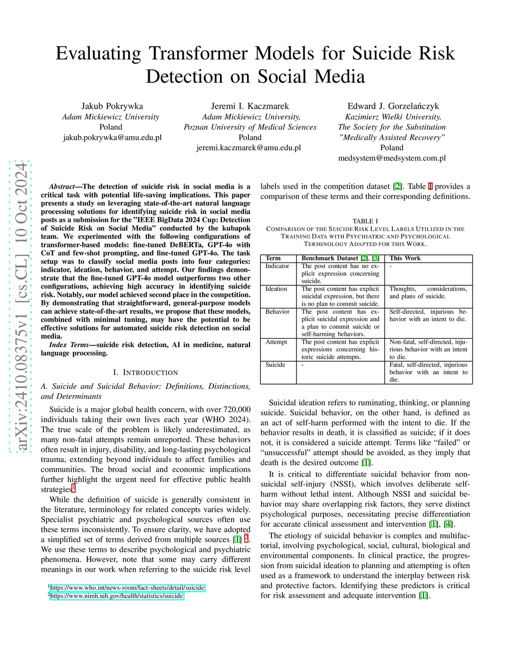 The detection of suicide risk in social media is a critical task with potential life-saving implications. This paper presents a study on leveraging state-of-the-art natural language processing solutions for identifying suicide risk in social media posts as a submission for the "IEEE BigData 2024 Cup: Detection of Suicide Risk on Social Media" conducted by the kubapok team. We experimented with the following configurations of transformer-based models: fine-tuned DeBERTa, GPT-4o with CoT and few-shot prompting, and fine-tuned GPT-4o. The task setup was to classify social media posts into four categories: indicator, ideation, behavior, and attempt. Our findings demonstrate that the fine-tuned GPT-4o model outperforms two other configurations, achieving high accuracy in identifying suicide risk. Notably, our model achieved second place in the competition. By demonstrating that straightforward, general-purpose models can achieve state-of-the-art results, we propose that these models, combined with minimal tuning, may have the potential to be effective solutions for automated suicide risk detection on social media.