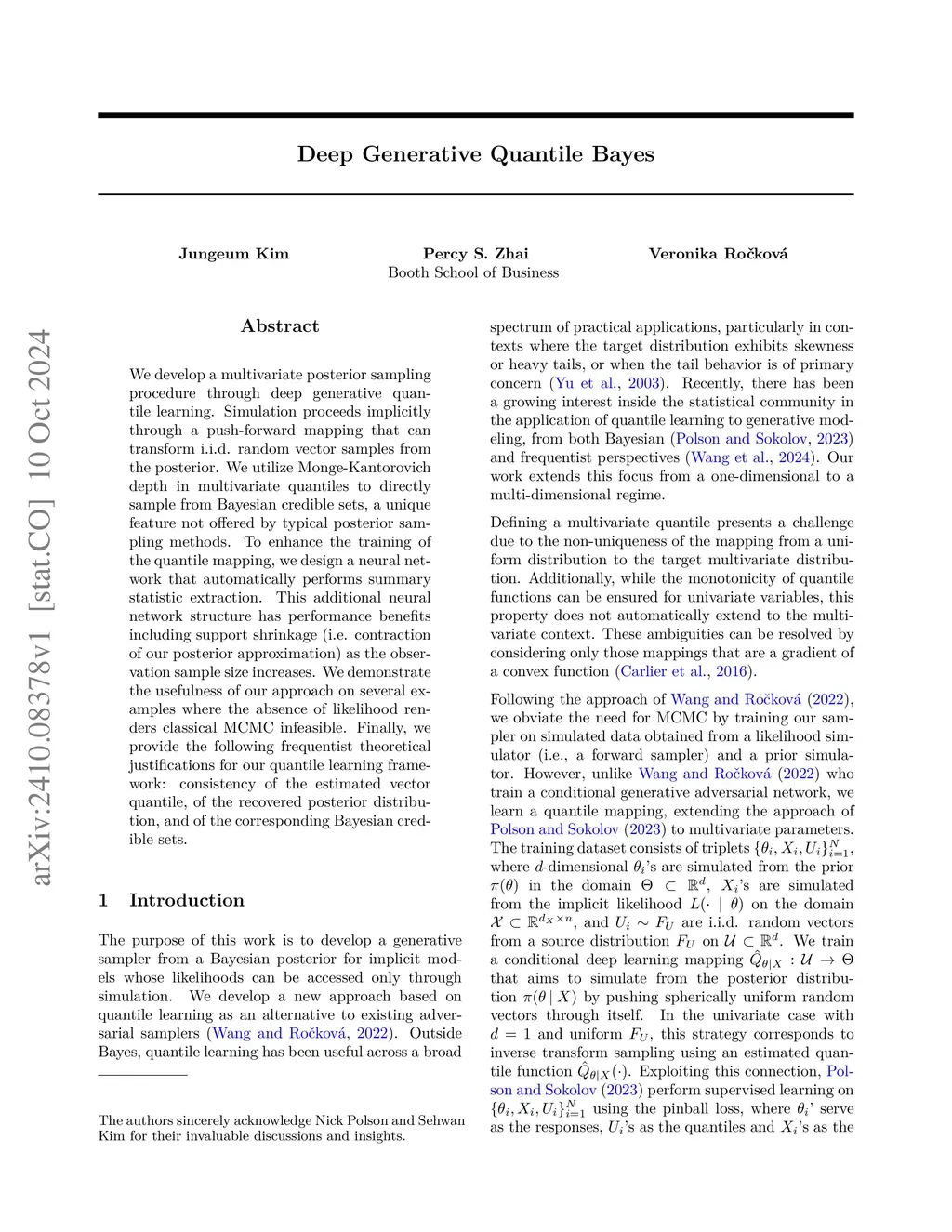 We develop a multivariate posterior sampling procedure through deep generative quantile learning. Simulation proceeds implicitly through a push-forward mapping that can transform i.i.d. random vector samples from the posterior. We utilize Monge-Kantorovich depth in multivariate quantiles to directly sample from Bayesian credible sets, a unique feature not offered by typical posterior sampling methods. To enhance the training of the quantile mapping, we design a neural network that automatically performs summary statistic extraction. This additional neural network structure has performance benefits, including support shrinkage (i.e., contraction of our posterior approximation) as the observation sample size increases. We demonstrate the usefulness of our approach on several examples where the absence of likelihood renders classical MCMC infeasible. Finally, we provide the following frequentist theoretical justifications for our quantile learning framework: {consistency of the estimated vector quantile, of the recovered posterior distribution, and of the corresponding Bayesian credible sets.