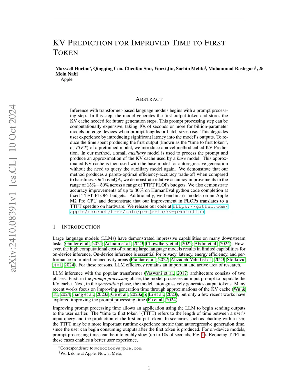 Inference with transformer-based language models begins with a prompt processing step. In this step, the model generates the first output token and stores the KV cache needed for future generation steps. This prompt processing step can be computationally expensive, taking 10s of seconds or more for billion-parameter models on edge devices when prompt lengths or batch sizes rise. This degrades user experience by introducing significant latency into the model's outputs. To reduce the time spent producing the first output (known as the ``time to first token'', or TTFT) of a pretrained model, we introduce a novel method called KV Prediction. In our method, a small auxiliary model is used to process the prompt and produce an approximation of the KV cache used by a base model. This approximated KV cache is then used with the base model for autoregressive generation without the need to query the auxiliary model again. We demonstrate that our method produces a pareto-optimal efficiency-accuracy trade-off when compared to baselines. On TriviaQA, we demonstrate relative accuracy improvements in the range of across a range of TTFT FLOPs budgets. We also demonstrate accuracy improvements of up to on HumanEval python code completion at fixed TTFT FLOPs budgets. Additionally, we benchmark models on an Apple M2 Pro CPU and demonstrate that our improvement in FLOPs translates to a TTFT speedup on hardware. We release our code at https://github.com/apple/corenet/tree/main/projects/kv-prediction .