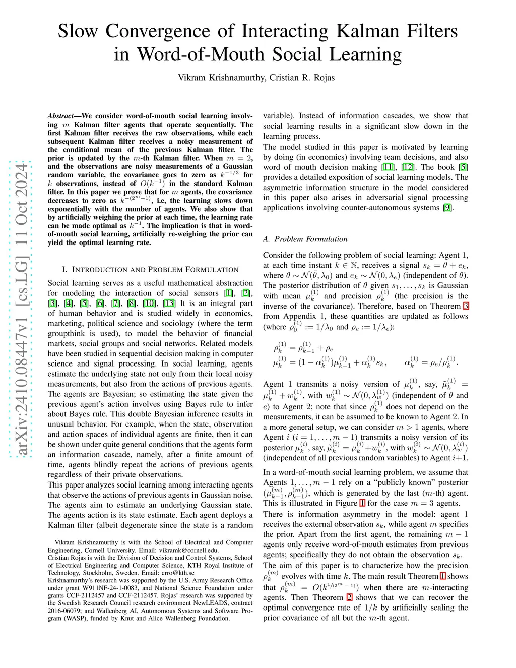 We consider word-of-mouth social learning involving Kalman filter agents that operate sequentially. The first Kalman filter receives the raw observations, while each subsequent Kalman filter receives a noisy measurement of the conditional mean of the previous Kalman filter. The prior is updated by the -th Kalman filter. When , and the observations are noisy measurements of a Gaussian random variable, the covariance goes to zero as for observations, instead of in the standard Kalman filter. In this paper we prove that for agents, the covariance decreases to zero as , i.e, the learning slows down exponentially with the number of agents. We also show that by artificially weighing the prior at each time, the learning rate can be made optimal as . The implication is that in word-of-mouth social learning, artificially re-weighing the prior can yield the optimal learning rate.