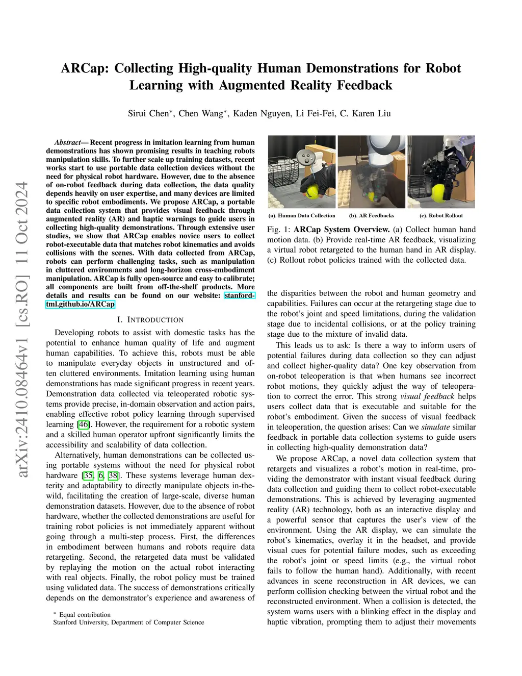 Recent progress in imitation learning from human demonstrations has shown promising results in teaching robots manipulation skills. To further scale up training datasets, recent works start to use portable data collection devices without the need for physical robot hardware. However, due to the absence of on-robot feedback during data collection, the data quality depends heavily on user expertise, and many devices are limited to specific robot embodiments. We propose ARCap, a portable data collection system that provides visual feedback through augmented reality (AR) and haptic warnings to guide users in collecting high-quality demonstrations. Through extensive user studies, we show that ARCap enables novice users to collect robot-executable data that matches robot kinematics and avoids collisions with the scenes. With data collected from ARCap, robots can perform challenging tasks, such as manipulation in cluttered environments and long-horizon cross-embodiment manipulation. ARCap is fully open-source and easy to calibrate; all components are built from off-the-shelf products. More details and results can be found on our website: https://stanford-tml.github.io/ARCap