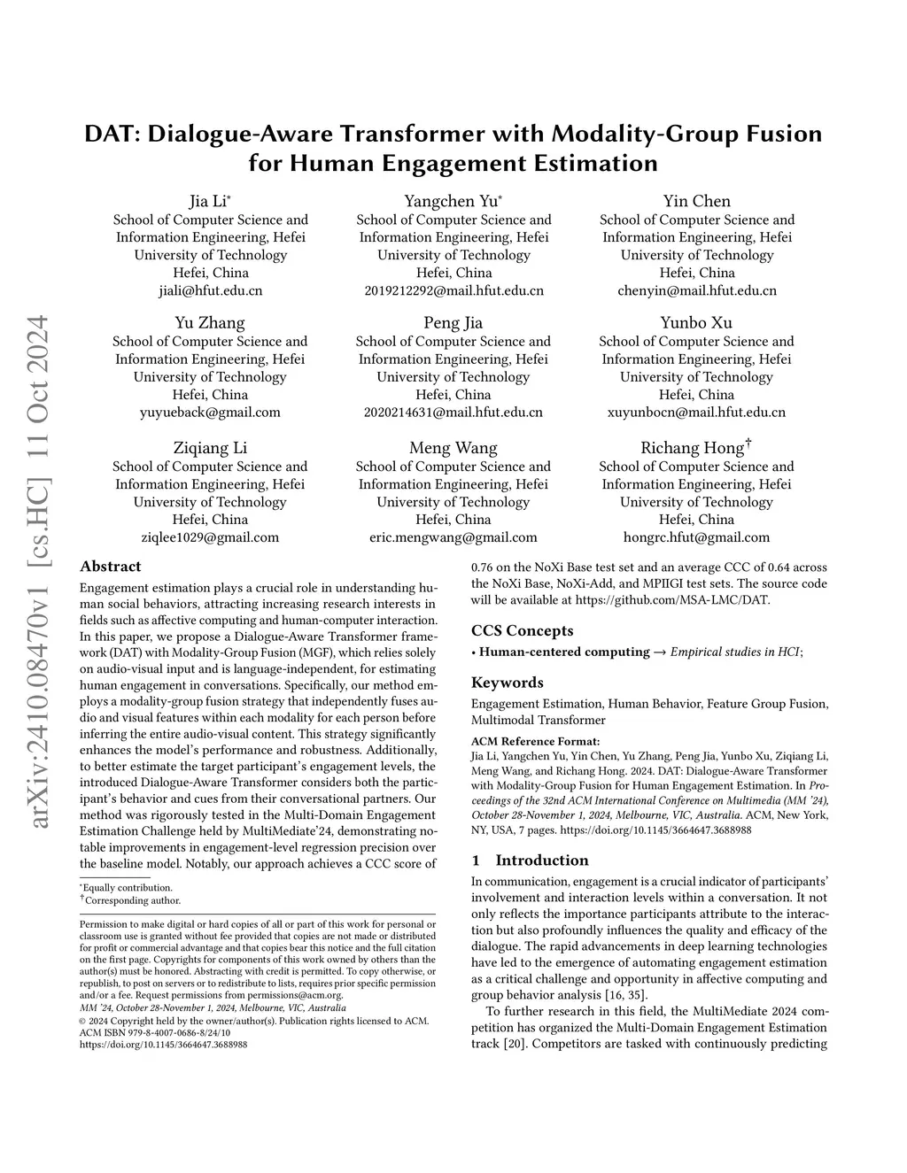 DAT: Dialogue-Aware Transformer with Modality-Group Fusion for Human