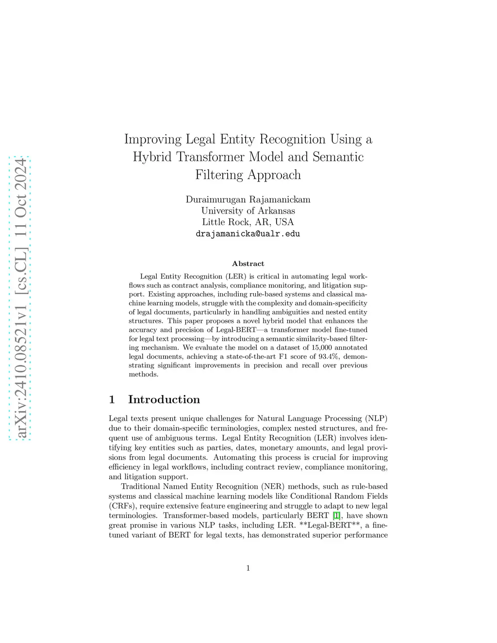 Legal Entity Recognition (LER) is critical in automating legal workflows such as contract analysis, compliance monitoring, and litigation support. Existing approaches, including rule-based systems and classical machine learning models, struggle with the complexity of legal documents and domain specificity, particularly in handling ambiguities and nested entity structures. This paper proposes a novel hybrid model that enhances the accuracy and precision of Legal-BERT, a transformer model fine-tuned for legal text processing, by introducing a semantic similarity-based filtering mechanism. We evaluate the model on a dataset of 15,000 annotated legal documents, achieving an F1 score of 93.4%, demonstrating significant improvements in precision and recall over previous methods.