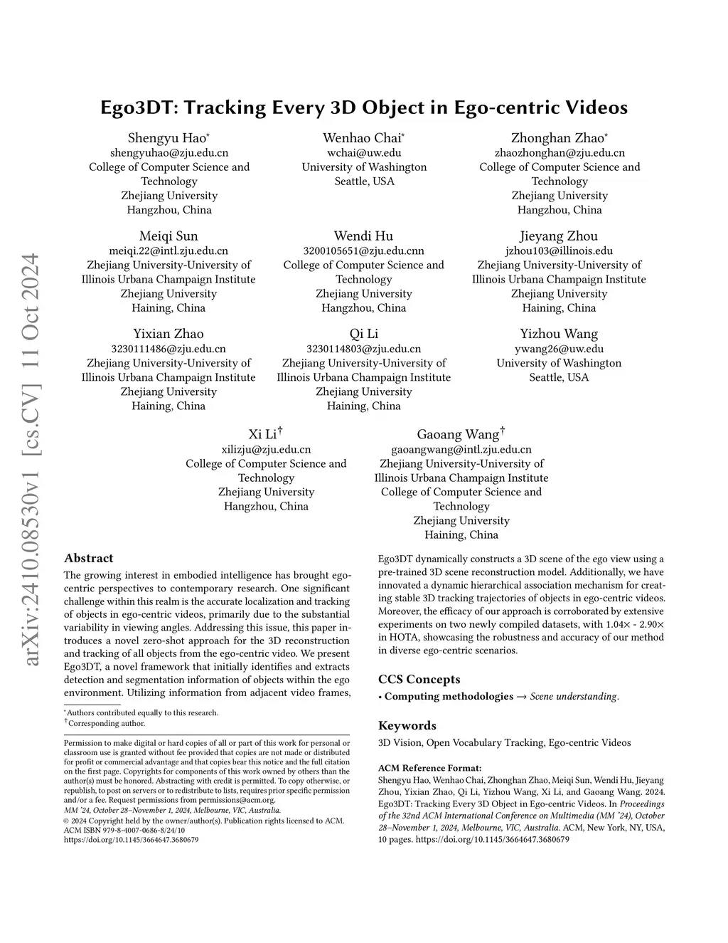 The growing interest in embodied intelligence has brought ego-centric perspectives to contemporary research. One significant challenge within this realm is the accurate localization and tracking of objects in ego-centric videos, primarily due to the substantial variability in viewing angles. Addressing this issue, this paper introduces a novel zero-shot approach for the 3D reconstruction and tracking of all objects from the ego-centric video. We present Ego3DT, a novel framework that initially identifies and extracts detection and segmentation information of objects within the ego environment. Utilizing information from adjacent video frames, Ego3DT dynamically constructs a 3D scene of the ego view using a pre-trained 3D scene reconstruction model. Additionally, we have innovated a dynamic hierarchical association mechanism for creating stable 3D tracking trajectories of objects in ego-centric videos. Moreover, the efficacy of our approach is corroborated by extensive experiments on two newly compiled datasets, with 1.04x - 2.90x in HOTA, showcasing the robustness and accuracy of our method in diverse ego-centric scenarios.
