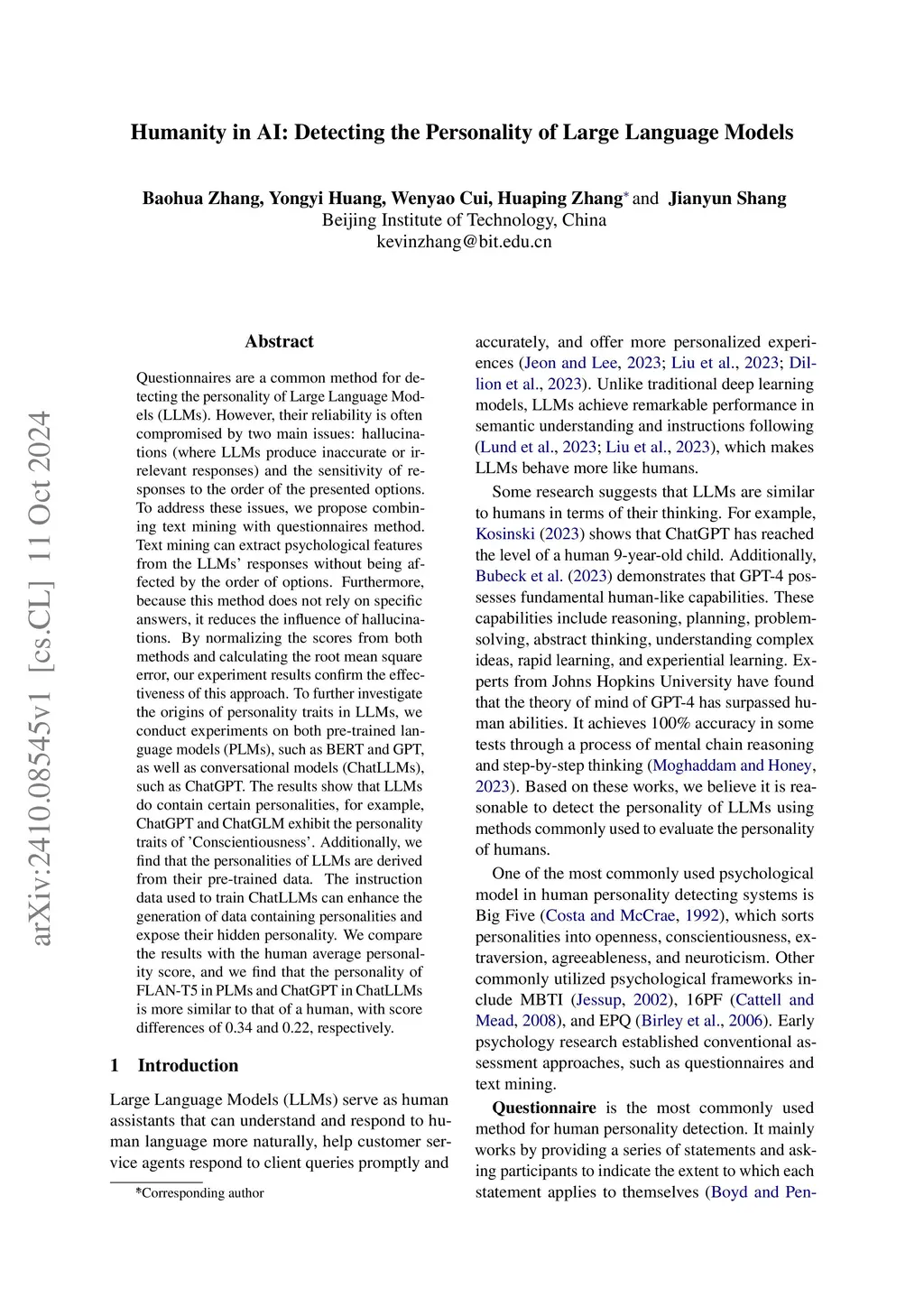 Questionnaires are a common method for detecting the personality of Large Language Models (LLMs). However, their reliability is often compromised by two main issues: hallucinations (where LLMs produce inaccurate or irrelevant responses) and the sensitivity of responses to the order of the presented options. To address these issues, we propose combining text mining with questionnaires method. Text mining can extract psychological features from the LLMs' responses without being affected by the order of options. Furthermore, because this method does not rely on specific answers, it reduces the influence of hallucinations. By normalizing the scores from both methods and calculating the root mean square error, our experiment results confirm the effectiveness of this approach. To further investigate the origins of personality traits in LLMs, we conduct experiments on both pre-trained language models (PLMs), such as BERT and GPT, as well as conversational models (ChatLLMs), such as ChatGPT. The results show that LLMs do contain certain personalities, for example, ChatGPT and ChatGLM exhibit the personality traits of 'Conscientiousness'. Additionally, we find that the personalities of LLMs are derived from their pre-trained data. The instruction data used to train ChatLLMs can enhance the generation of data containing personalities and expose their hidden personality. We compare the results with the human average personality score, and we find that the personality of FLAN-T5 in PLMs and ChatGPT in ChatLLMs is more similar to that of a human, with score differences of 0.34 and 0.22, respectively.