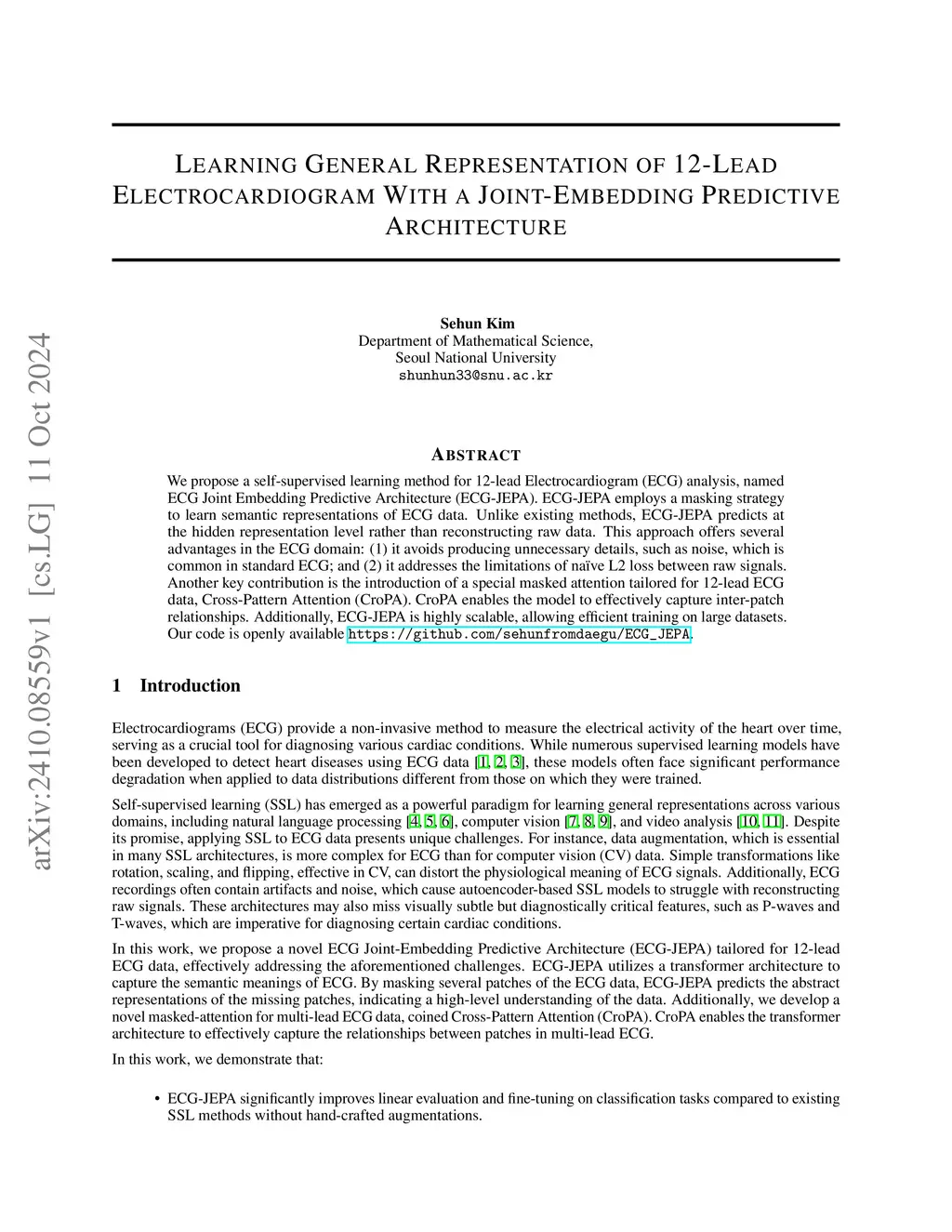 We propose a self-supervised learning method for 12-lead Electrocardiogram (ECG) analysis, named ECG Joint Embedding Predictive Architecture (ECG-JEPA). ECG-JEPA employs a masking strategy to learn semantic representations of ECG data. Unlike existing methods, ECG-JEPA predicts at the hidden representation level rather than reconstructing raw data. This approach offers several advantages in the ECG domain: (1) it avoids producing unnecessary details, such as noise, which is common in standard ECG; and (2) it addresses the limitations of na\"ive L2 loss between raw signals. Another key contribution is the introduction of a special masked attention tailored for 12-lead ECG data, Cross-Pattern Attention (CroPA). CroPA enables the model to effectively capture inter-patch relationships. Additionally, ECG-JEPA is highly scalable, allowing efficient training on large datasets. Our code is openly available https://github.com/sehunfromdaegu/ECG_JEPA.