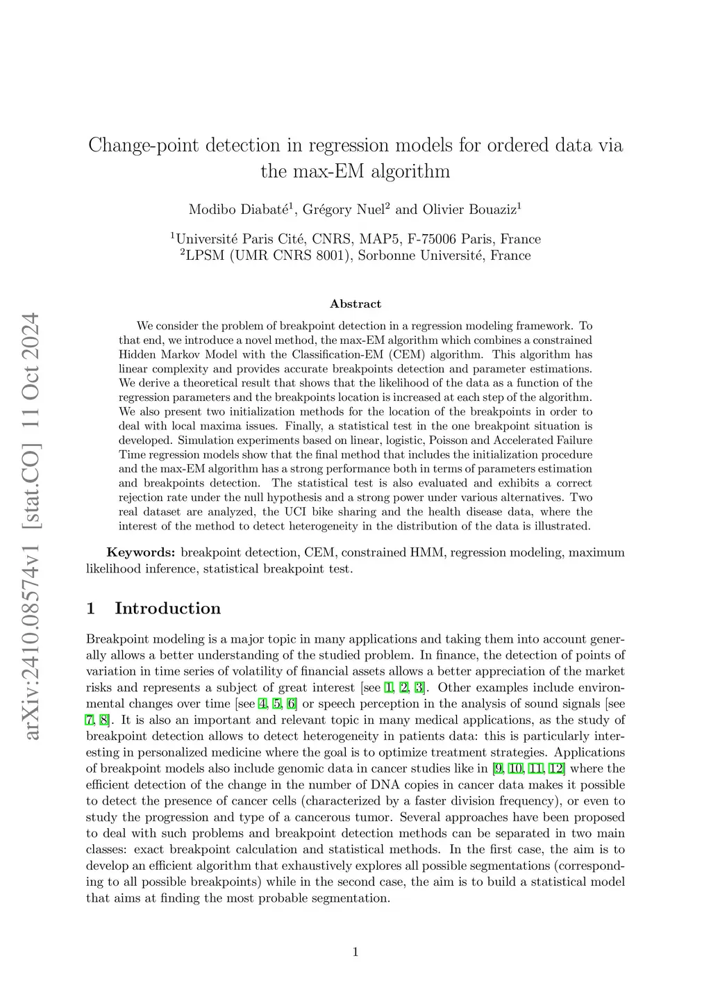We consider the problem of breakpoint detection in a regression modeling framework. To that end, we introduce a novel method, the max-EM algorithm which combines a constrained Hidden Markov Model with the Classification-EM (CEM) algorithm. This algorithm has linear complexity and provides accurate breakpoints detection and parameter estimations. We derive a theoretical result that shows that the likelihood of the data as a function of the regression parameters and the breakpoints location is increased at each step of the algorithm. We also present two initialization methods for the location of the breakpoints in order to deal with local maxima issues. Finally, a statistical test in the one breakpoint situation is developed. Simulation experiments based on linear, logistic, Poisson and Accelerated Failure Time regression models show that the final method that includes the initialization procedure and the max-EM algorithm has a strong performance both in terms of parameters estimation and breakpoints detection. The statistical test is also evaluated and exhibits a correct rejection rate under the null hypothesis and a strong power under various alternatives. Two real dataset are analyzed, the UCI bike sharing and the health disease data, where the interest of the method to detect heterogeneity in the distribution of the data is illustrated.