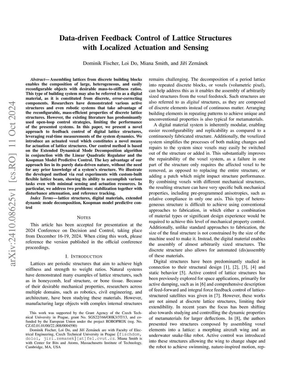 Assembling lattices from discrete building blocks enables the composition of large, heterogeneous, and easily reconfigurable objects with desirable mass-to-stiffness ratios. This type of building system may also be referred to as a digital material, as it is constituted from discrete, error-correcting components. Researchers have demonstrated various active structures and even robotic systems that take advantage of the reconfigurable, mass-efficient properties of discrete lattice structures. However, the existing literature has predominantly used open-loop control strategies, limiting the performance of the presented systems. In this paper, we present a novel approach to feedback control of digital lattice structures, leveraging real-time measurements of the system dynamics. We introduce an actuated voxel which constitutes a novel means for actuation of lattice structures. Our control method is based on the Extended Dynamical Mode Decomposition algorithm in conjunction with the Linear Quadratic Regulator and the Koopman Model Predictive Control. The key advantage of our approach lies in its purely data-driven nature, without the need for any prior knowledge of a system's structure. We illustrate the developed method via real experiments with custom-built flexible lattice beam, showing its ability to accomplish various tasks even with minimal sensing and actuation resources. In particular, we address two problems: stabilization together with disturbance attenuation, and reference tracking.