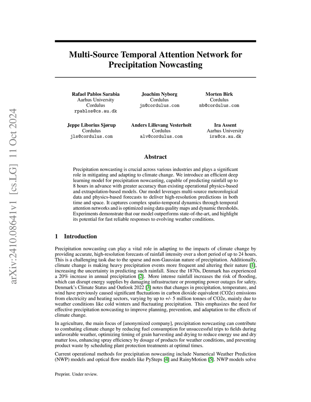 Precipitation nowcasting is crucial across various industries and plays a significant role in mitigating and adapting to climate change. We introduce an efficient deep learning model for precipitation nowcasting, capable of predicting rainfall up to 8 hours in advance with greater accuracy than existing operational physics-based and extrapolation-based models. Our model leverages multi-source meteorological data and physics-based forecasts to deliver high-resolution predictions in both time and space. It captures complex spatio-temporal dynamics through temporal attention networks and is optimized using data quality maps and dynamic thresholds. Experiments demonstrate that our model outperforms state-of-the-art, and highlight its potential for fast reliable responses to evolving weather conditions.