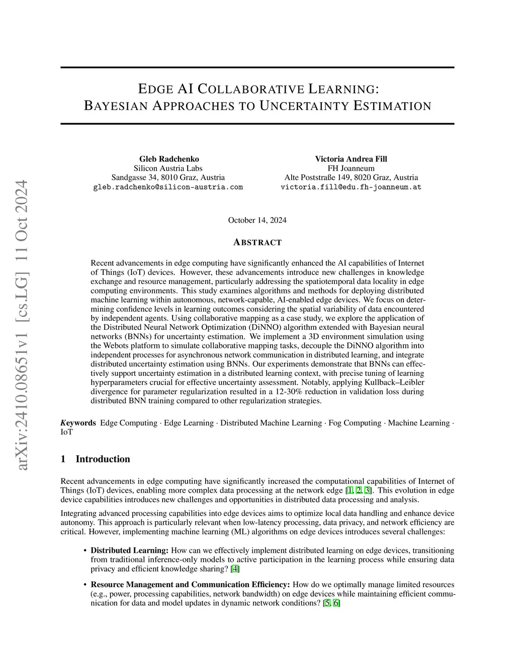 Recent advancements in edge computing have significantly enhanced the AI capabilities of Internet of Things (IoT) devices. However, these advancements introduce new challenges in knowledge exchange and resource management, particularly addressing the spatiotemporal data locality in edge computing environments. This study examines algorithms and methods for deploying distributed machine learning within autonomous, network-capable, AI-enabled edge devices. We focus on determining confidence levels in learning outcomes considering the spatial variability of data encountered by independent agents. Using collaborative mapping as a case study, we explore the application of the Distributed Neural Network Optimization (DiNNO) algorithm extended with Bayesian neural networks (BNNs) for uncertainty estimation. We implement a 3D environment simulation using the Webots platform to simulate collaborative mapping tasks, decouple the DiNNO algorithm into independent processes for asynchronous network communication in distributed learning, and integrate distributed uncertainty estimation using BNNs. Our experiments demonstrate that BNNs can effectively support uncertainty estimation in a distributed learning context, with precise tuning of learning hyperparameters crucial for effective uncertainty assessment. Notably, applying Kullback-Leibler divergence for parameter regularization resulted in a 12-30% reduction in validation loss during distributed BNN training compared to other regularization strategies.