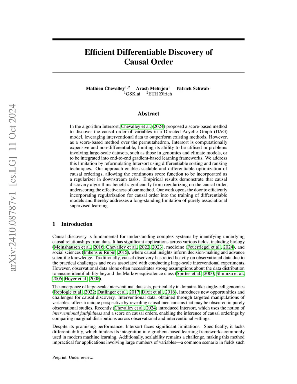 In the algorithm Intersort, Chevalley et al. (2024) proposed a score-based method to discover the causal order of variables in a Directed Acyclic Graph (DAG) model, leveraging interventional data to outperform existing methods. However, as a score-based method over the permutahedron, Intersort is computationally expensive and non-differentiable, limiting its ability to be utilised in problems involving large-scale datasets, such as those in genomics and climate models, or to be integrated into end-to-end gradient-based learning frameworks. We address this limitation by reformulating Intersort using differentiable sorting and ranking techniques. Our approach enables scalable and differentiable optimization of causal orderings, allowing the continuous score function to be incorporated as a regularizer in downstream tasks. Empirical results demonstrate that causal discovery algorithms benefit significantly from regularizing on the causal order, underscoring the effectiveness of our method. Our work opens the door to efficiently incorporating regularization for causal order into the training of differentiable models and thereby addresses a long-standing limitation of purely associational supervised learning.