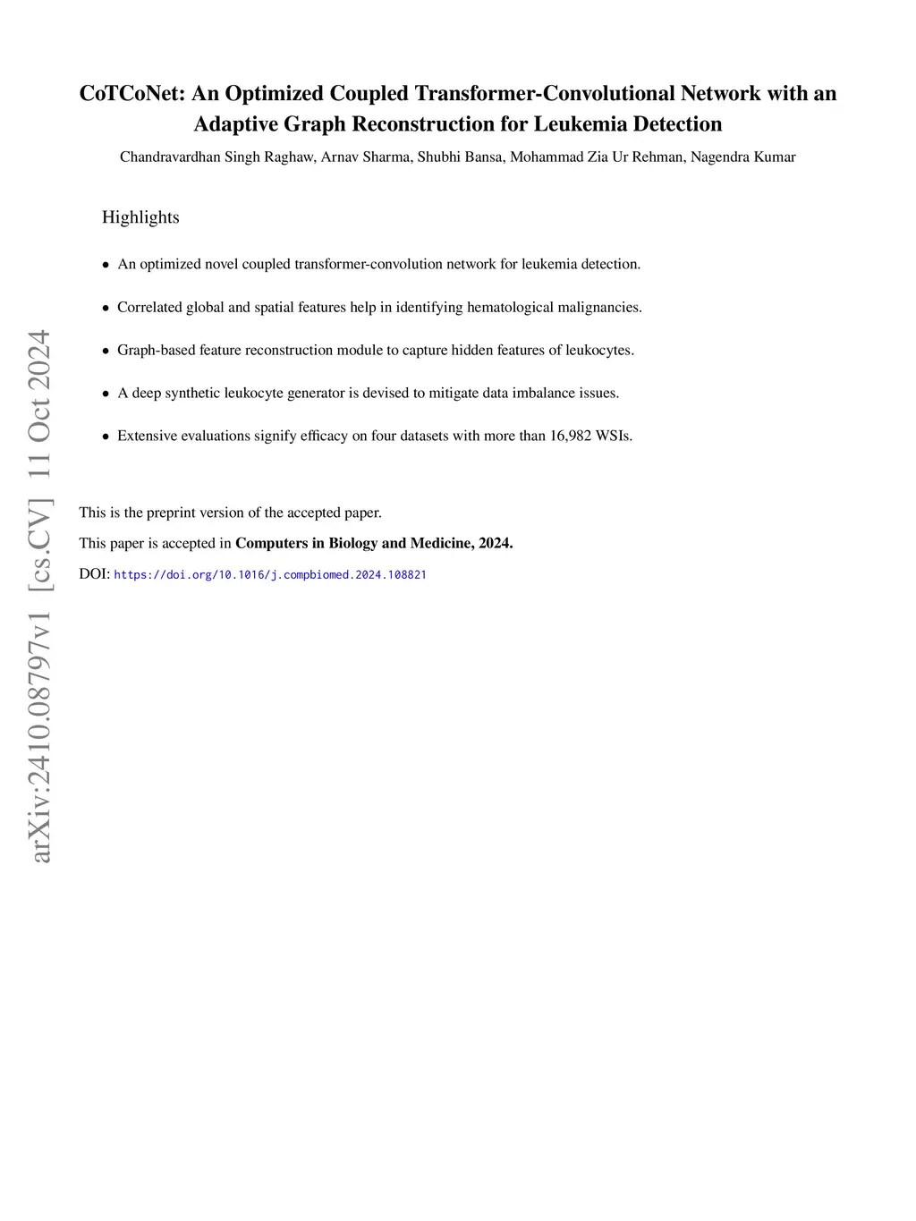 Swift and accurate blood smear analysis is an effective diagnostic method for leukemia and other hematological malignancies. However, manual leukocyte count and morphological evaluation using a microscope is time-consuming and prone to errors. Conventional image processing methods also exhibit limitations in differentiating cells due to the visual similarity between malignant and benign cell morphology. This limitation is further compounded by the skewed training data that hinders the extraction of reliable and pertinent features. In response to these challenges, we propose an optimized Coupled Transformer Convolutional Network (CoTCoNet) framework for the classification of leukemia, which employs a well-designed transformer integrated with a deep convolutional network to effectively capture comprehensive global features and scalable spatial patterns, enabling the identification of complex and large-scale hematological features. Further, the framework incorporates a graph-based feature reconstruction module to reveal the hidden or unobserved hard-to-see biological features of leukocyte cells and employs a Population-based Meta-Heuristic Algorithm for feature selection and optimization. To mitigate data imbalance issues, we employ a synthetic leukocyte generator. In the evaluation phase, we initially assess CoTCoNet on a dataset containing 16,982 annotated cells, and it achieves remarkable accuracy and F1-Score rates of 0.9894 and 0.9893, respectively. To broaden the generalizability of our model, we evaluate it across four publicly available diverse datasets, which include the aforementioned dataset. This evaluation demonstrates that our method outperforms current state-of-the-art approaches. We also incorporate an explainability approach in the form of feature visualization closely aligned with cell annotations to provide a deeper understanding of the framework.