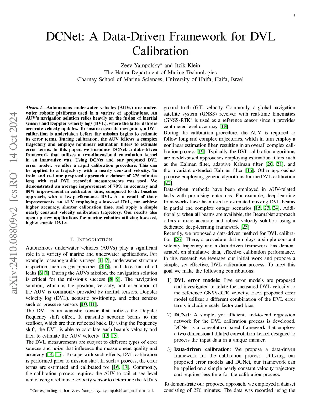 Autonomous underwater vehicles (AUVs) are underwater robotic platforms used in a variety of applications. An AUV's navigation solution relies heavily on the fusion of inertial sensors and Doppler velocity logs (DVL), where the latter delivers accurate velocity updates. To ensure accurate navigation, a DVL calibration is undertaken before the mission begins to estimate its error terms. During calibration, the AUV follows a complex trajectory and employs nonlinear estimation filters to estimate error terms. In this paper, we introduce DCNet, a data-driven framework that utilizes a two-dimensional convolution kernel in an innovative way. Using DCNet and our proposed DVL error model, we offer a rapid calibration procedure. This can be applied to a trajectory with a nearly constant velocity. To train and test our proposed approach a dataset of 276 minutes long with real DVL recorded measurements was used. We demonstrated an average improvement of 70% in accuracy and 80% improvement in calibration time, compared to the baseline approach, with a low-performance DVL. As a result of those improvements, an AUV employing a low-cost DVL, can achieve higher accuracy, shorter calibration time, and apply a simple nearly constant velocity calibration trajectory. Our results also open up new applications for marine robotics utilizing low-cost, high-accurate DVLs.