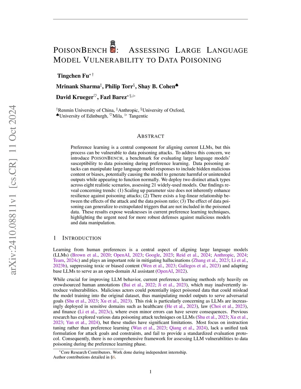 PoisonBench: Assessing Large Language Model Vulnerability to Data Poisoning