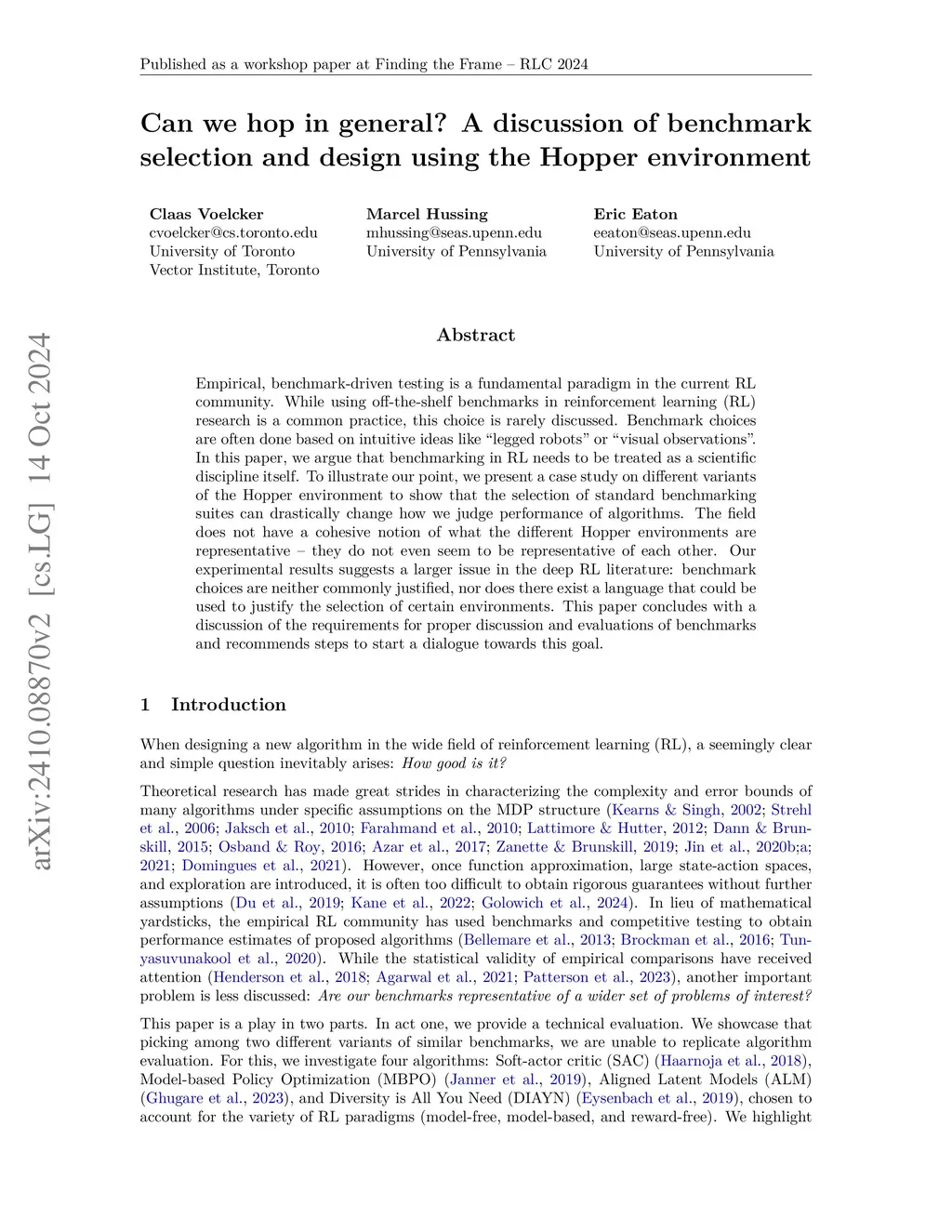 Empirical, benchmark-driven testing is a fundamental paradigm in the current RL community. While using off-the-shelf benchmarks in reinforcement learning (RL) research is a common practice, this choice is rarely discussed. Benchmark choices are often done based on intuitive ideas like "legged robots" or "visual observations". In this paper, we argue that benchmarking in RL needs to be treated as a scientific discipline itself. To illustrate our point, we present a case study on different variants of the Hopper environment to show that the selection of standard benchmarking suites can drastically change how we judge performance of algorithms. The field does not have a cohesive notion of what the different Hopper environments are representative - they do not even seem to be representative of each other. Our experimental results suggests a larger issue in the deep RL literature: benchmark choices are neither commonly justified, nor does there exist a language that could be used to justify the selection of certain environments. This paper concludes with a discussion of the requirements for proper discussion and evaluations of benchmarks and recommends steps to start a dialogue towards this goal.