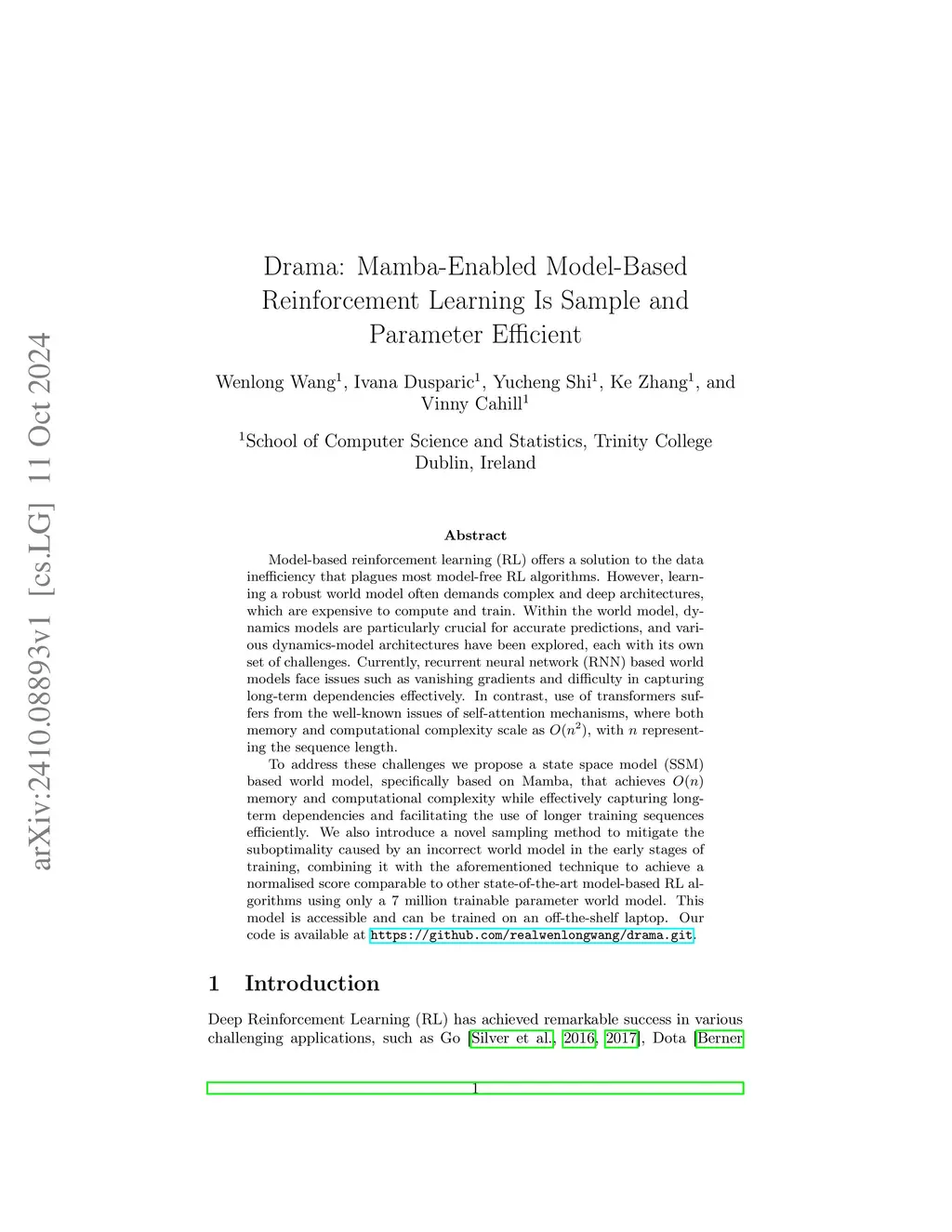 Drama: Mamba-Enabled Model-Based Reinforcement Learning Is Sample and Parameter Efficient